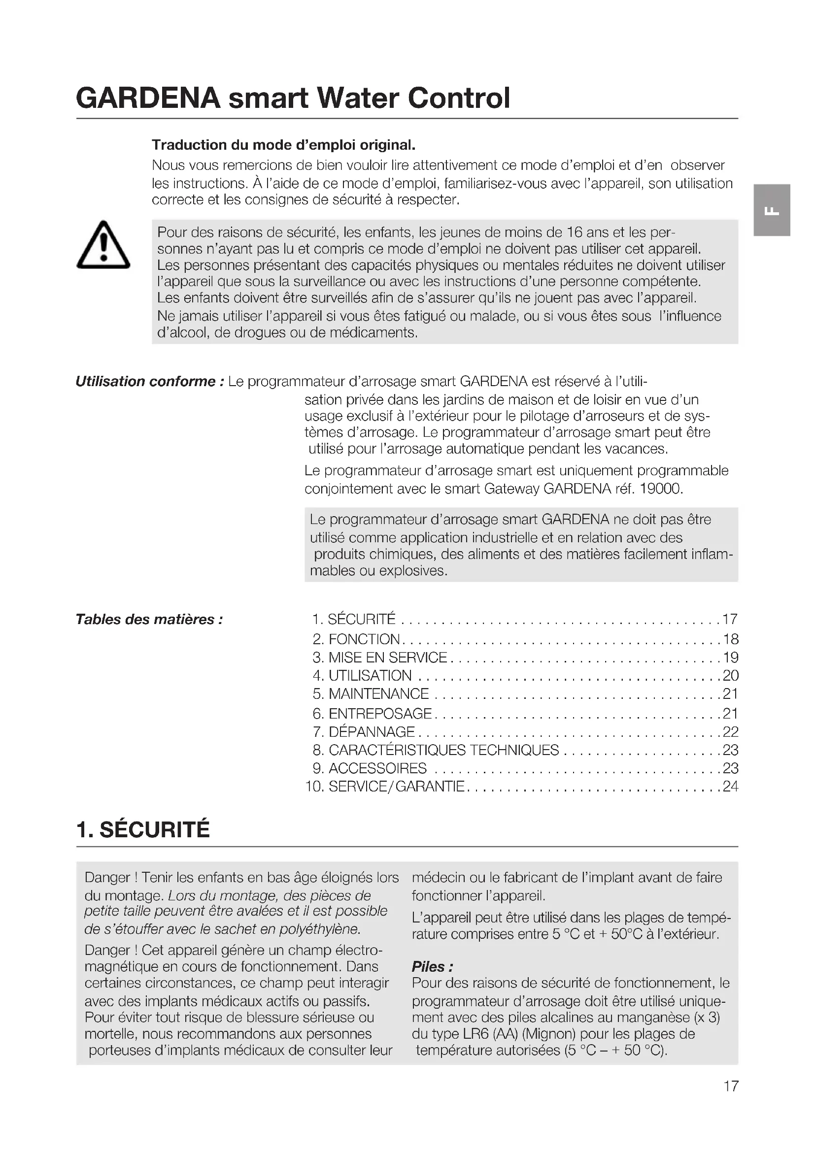 GBGARDENA smart Water Control Traduction du mode d’emploi original. Nous vous remercions de bien vouloir lire attentivement ce mode d’emploi et d’en observer les instructions. À l’aide de ce mode d’emploi, familiarisez-vous avec l’appareil, son utilisation correcte et les consignes de sécurité à respecter. Pour des raisons de sécurité, les enfants, les jeunes de moins de 16 ans et les per- sonnesn’ayant pas lu et compris ce mode d’emploi ne doivent pas utiliser cet appareil. Les personnes présentant des capacités physiques ou mentales réduites ne doivent utiliser l’appareil que sous la surveillance ou avec les instructions d’une personne compétente. Les enfants doivent être surveillés afin de s’assurer qu’ils ne jouent pas avec l’appareil. Ne jamais utiliser l’appareil si vous êtes fatigué ou malade, ou si vous êtes sous l’influence d’alcool, de drogues ou de médicaments. Utilisation conforme : Le programmateur d’arrosage smart GARDENA est réservé à l’utili- sation privée dans les jardins de maison et de loisir en vue d’un usage exclusif à l’extérieur pour le pilotage d’arroseurs et de sys- tèmes d’arrosage. Le programmateur d’arrosage smart peut être utilisé pour l’arrosage automatique pendant les vacances. Le programmateur d’arrosage smart est uniquement programmable conjointement avec le smart Gateway GARDENA réf. 19000. Le programmateur d’arrosage smart GARDENA ne doit pas être utilisé comme application industrielle et en relation avec des produits chimiques, des aliments et des matières facilement inflam- mables ou explosives. Tables des matières : 1. SÉCURITÉ ........................................17