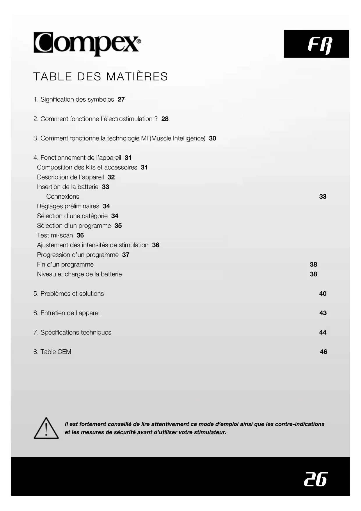 Il est fortement conseillé de lire attentivement ce mode d’emploi ainsi que les contre-indications et les mesures de sécurité avant d’utiliser votre stimulateur.27