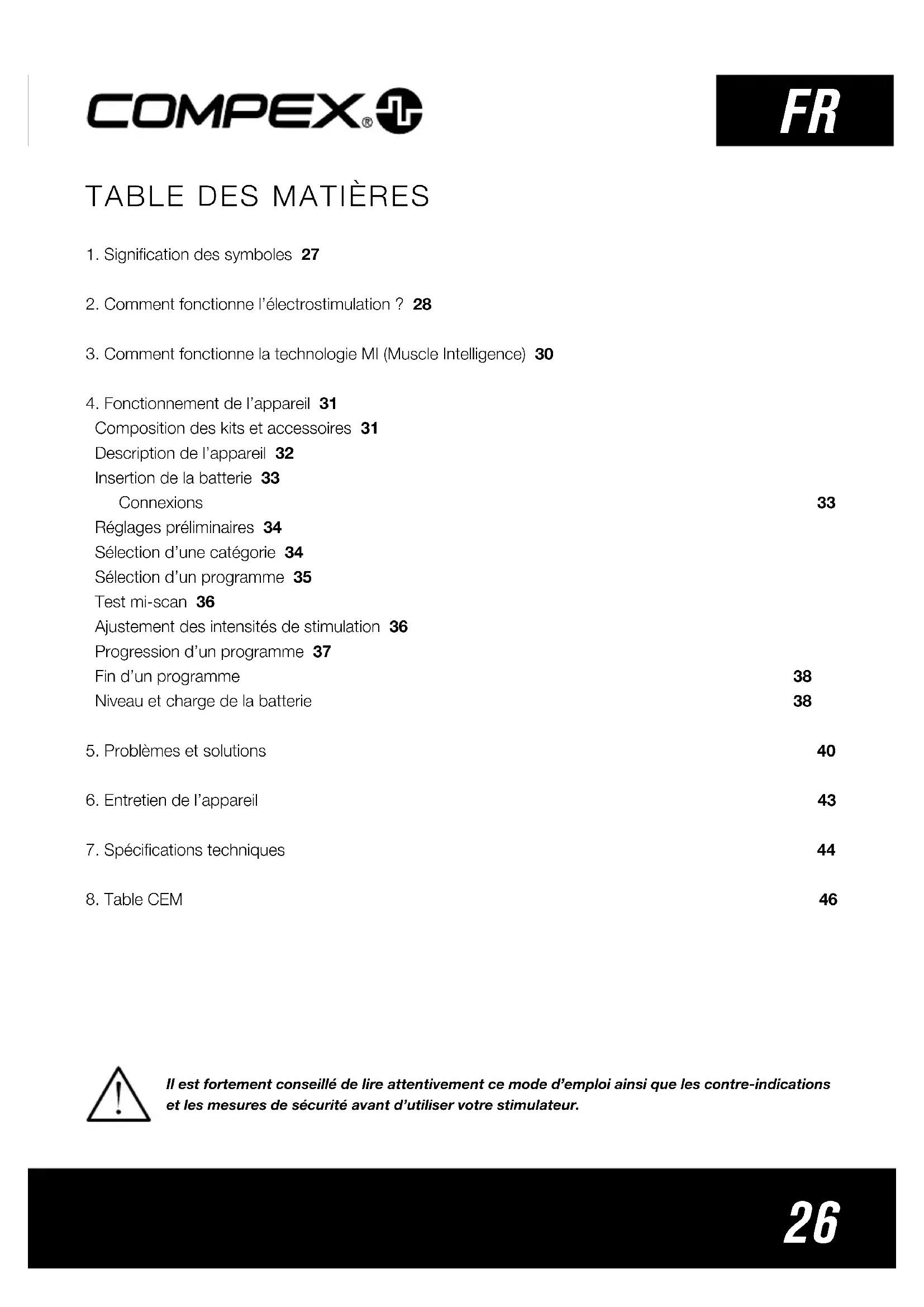 Il est fortement conseillé de lire attentivement ce mode d’emploi ainsi que les contre-indications et les mesures de sécurité avant d’utiliser votre stimulateur.27