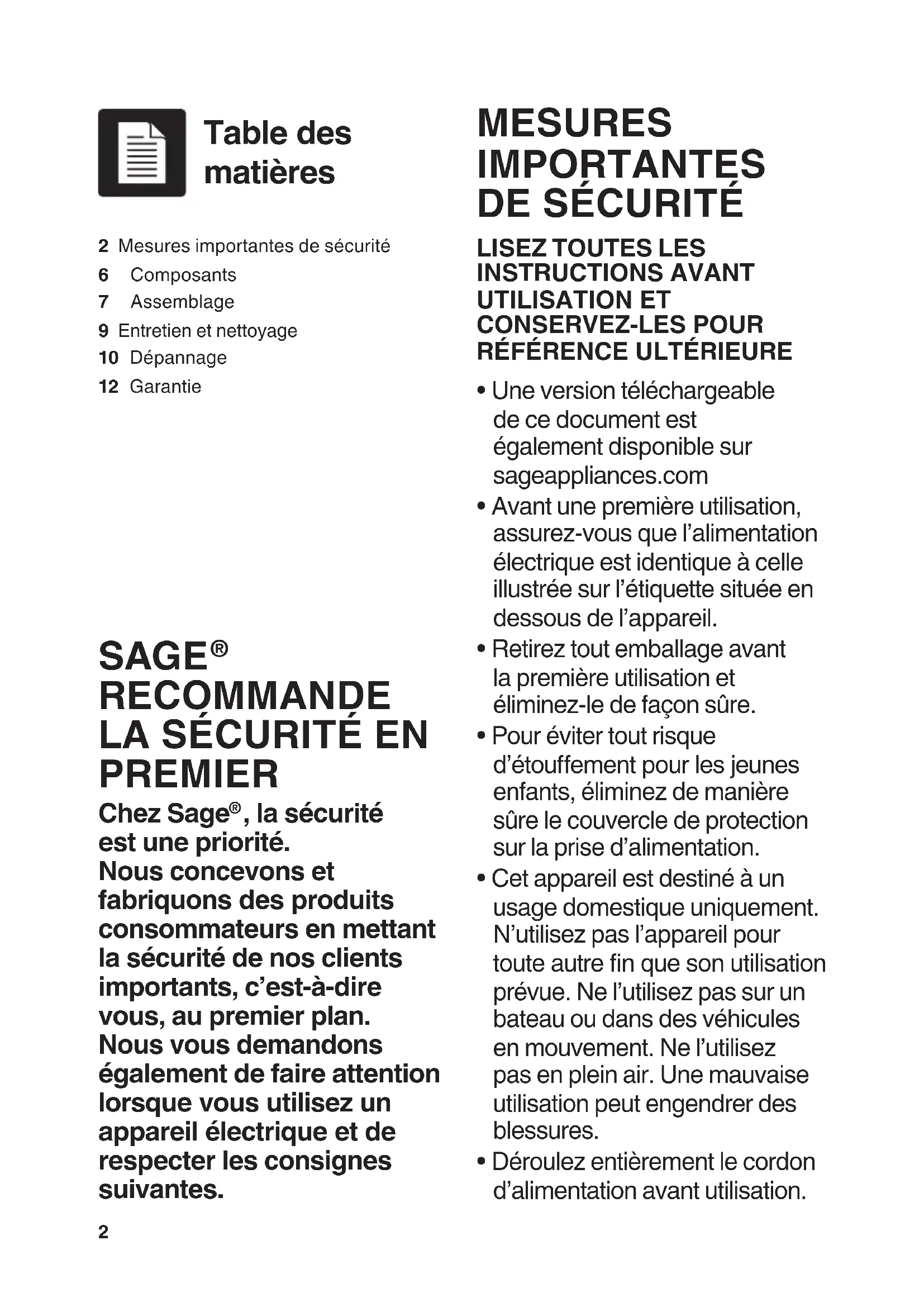 2 Mesures importantes de sécurité6 Composants7 Assemblage9 Entretien et nettoyage10 Dépannage12 Garantie Table des matières SAGE