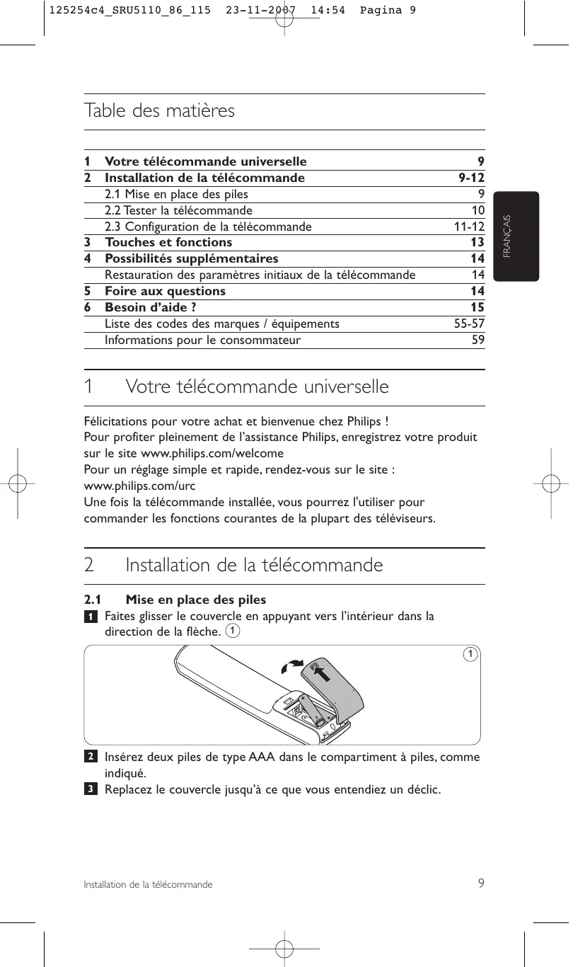 Conseil Si le téléviseur ne répond pas à certaines ou à toutes les touches, suivez les instructions de la section 2.3 « Configuration de la télécommande » ou si vous préférez une configuration en ligne, rendez-vous sur le site : www.philips.com/urc Configuration de la télécommande Cette opération n'est nécessaire que si votre téléviseur ne répond pas à la télécommande SRU 5110. Ce sera le cas si la SRU 5110 ne reconnaît pas la marque ou le modèle de votre téléviseur. Il vous faudra alors programmer la télécommande pour le téléviseur.