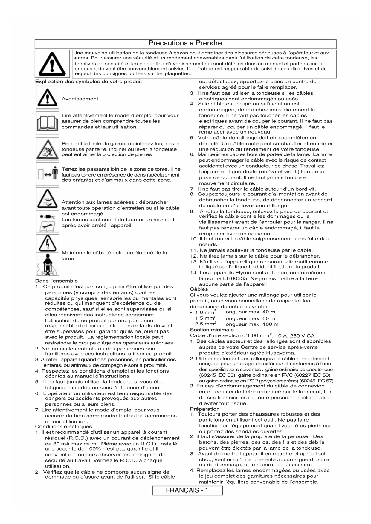 le jeu complet des garnitures nécessaires pour maintenir l’équilibre convenable de l’ensemble. Une mauvaise utilisation de la tondeuse à gazon peut entraîner des blessures sérieuses à l’opérateur et aux autres. Pour assurer une sécurité et un rendement convenables dans l’utilisation de cette tondeuse, les directives de sécurité et les plaquettes d’avertissement qui sont définies dans ce manuel et portées sur la tondeuse, doivent être convenablement suivies. L’opérateur est responsable du suivi de ces directives et du respect des consignes portées sur les plaquettes. FRANÇAIS - 1Precautions a Prendre Utilisation