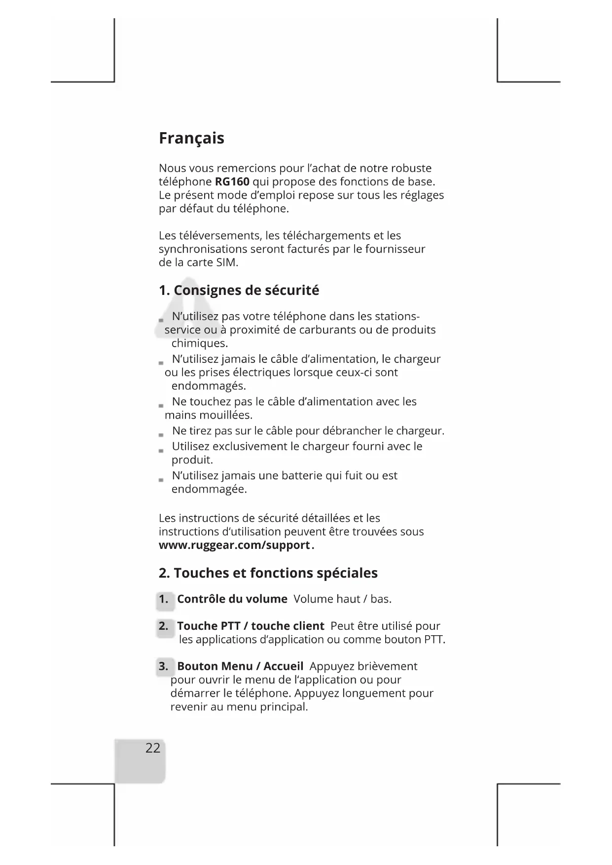 DAFrançais Nous vous remercions pour l’achat de notre robuste téléphone RG160 qui propose des fonctions de base. Le présent mode d’emploi repose sur tous les réglages par défaut du téléphone. Les téléversements, les téléchargements et les synchronisations seront facturés par le fournisseur de la carte SIM.