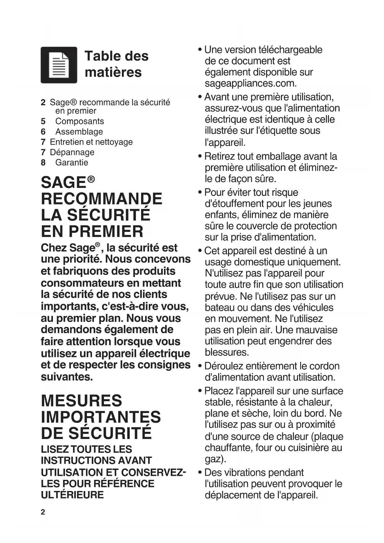 ULTÉRIEURE 2 Sage® recommande la sécurité en premier 5 Composants6 Assemblage7 Entretien et nettoyage7 Dépannage8 Garantie3