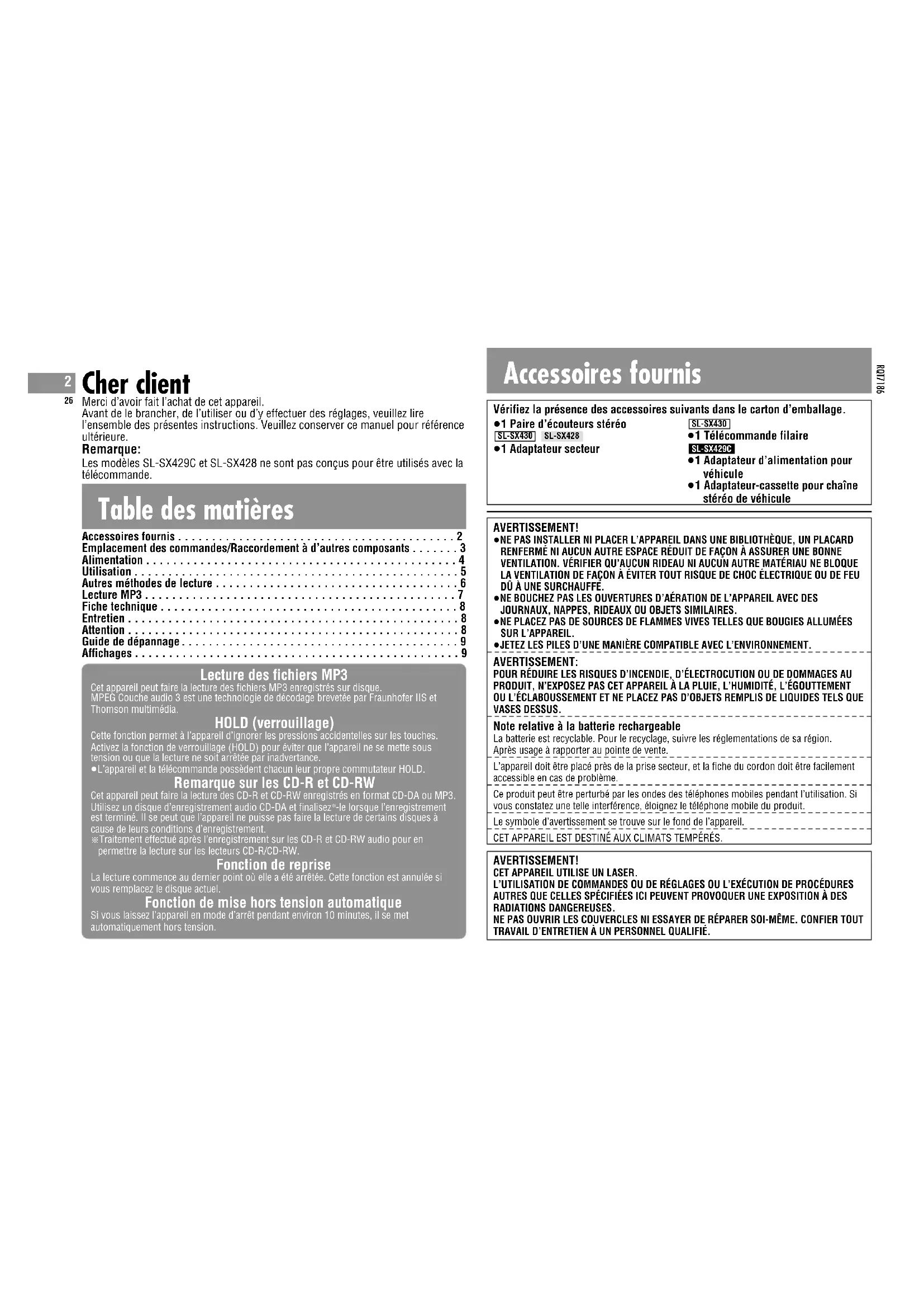 Vérifiez la présence des accessoires suivants dans le carton d’emballage. Table des matières Cher client Merci d’avoir fait l’achat de cet appareil. Avant de le brancher, de l’utiliser ou d’y effectuer des réglages, veuillez lire l’ensemble des présentes instructions. Veuillez conserver ce manuel pour référence ultérieure. Remarque: Les modèles SL-SX429C et SL-SX428 ne sont pas conçus pour être utilisés avec la télécommande. Lecture des fichiers MP3 Cet appareil peut faire la lecture des fichiers MP3 enregistrés sur disque. MPEG Couche audio 3 est une technologie de décodage brevetée par Fraunhofer IIS et Thomson multimédia. HOLD (verrouillage) Cette fonction permet à l’appareil d’ignorer les pressions accidentelles sur les touches. Activez la fonction de verrouillage (HOLD) pour éviter que l’appareil ne se mette sous tension ou que la lecture ne soit arrêtée par inadvertance. ≥L’appareil et la télécommande possèdent chacun leur propre commutateur HOLD. Remarque sur les CD-R et CD-RW Cet appareil peut faire la lecture des CD-R et CD-RW enregistrés en format CD-DA ou MP3. Utilisez un disque d’enregistrement audio CD-DA et finalisez
