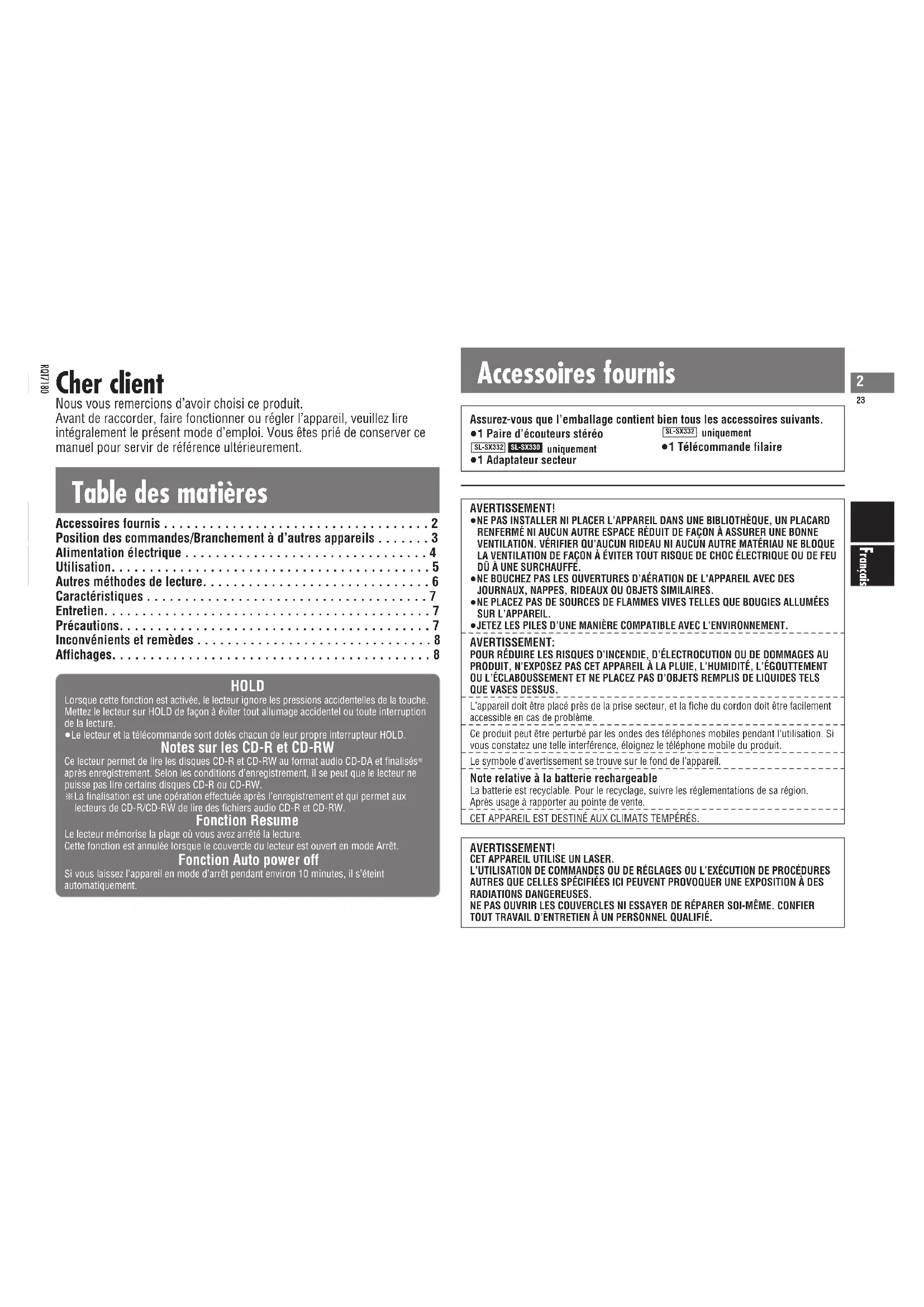 - FrançaisItaliano ≥1 Paire d’écouteurs stéréo uniquement ≥1 Adaptateur secteur uniquement ≥1 Télécommande filaire SL-SX332SL-SX330SL-SX332 Table des matières Cher client Nous vous remercions d’avoir choisi ce produit. Avant de raccorder, faire fonctionner ou régler l’appareil, veuillez lire intégralement le présent mode d’emploi. Vous êtes prié de conserver ce manuel pour servir de référence ultérieurement. HOLD Lorsque cette fonction est activée, le lecteur ignore les pressions accidentelles de la touche.Mettez le lecteur sur HOLD de façon à éviter tout allumage accidentel ou toute interruptionde la lecture.≥Le lecteur et la télécommande sont dotés chacun de leur propre interrupteur HOLD. Notes sur les CD-R et CD-RW Ce lecteur permet de lire les disques CD-R et CD-RW au format audio CD-DA et finalisés après enregistrement. Selon les conditions d’enregistrement, il se peut que le lecteur nepuisse pas lire certains disques CD-R ou CD-RW. §La finalisation est une opération effectuée après l’enregistrement et qui permet aux lecteurs de CD-R/CD-RW de lire des fichiers audio CD-R et CD-RW. Fonction Resume Le lecteur mémorise la plage où vous avez arrêté la lecture.Cette fonction est annulée lorsque le couvercle du lecteur est ouvert en mode Arrêt. Fonction Auto power off Si vous laissez l’appareil en mode d’arrêt pendant environ 10 minutes, il s’éteint automatiquement. Accessoires fournis Accessoires fournis p. 2