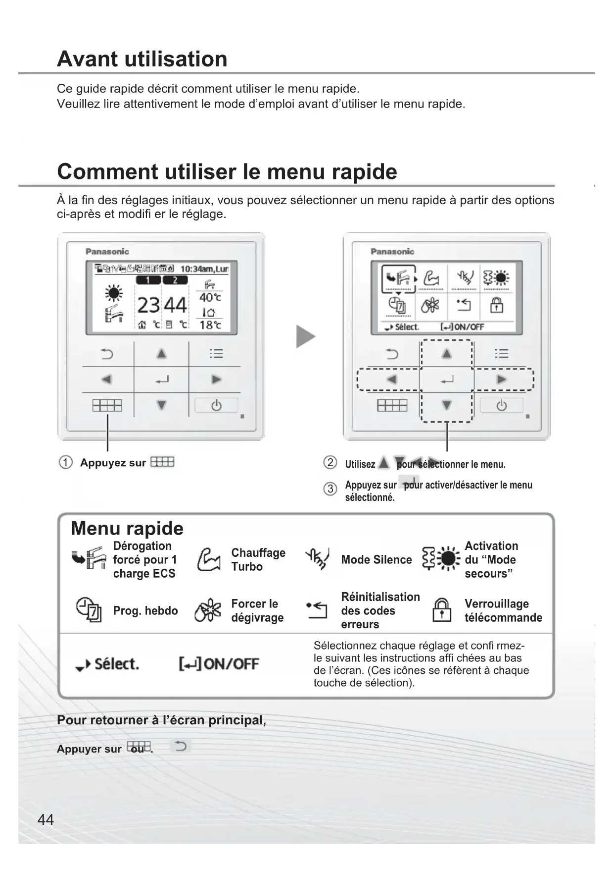 - Pokud vyberete „Ne“, zobrazí se hlavní obrazovka. Odemknutí dálkového ovladače Stiskněte libovolné tlačítko. (Při přijetí režimu se zobrazí následující obrazovka.) Zadejte 4 číslice (při zadání správného hesla se obrazovka odemkne). Obnovení zapomenutého hesla (na obrazovce VYPNUTÍ) Tiskněte , a nepřetržitě po dobu 5 sekund. (Při přijetí režimu se zobrazí následující obrazovka.) Vyberte „Reset“. (Obrazovka se vypne za 3 sekundy.) Zámek R/C44 Ce guide rapide décrit comment utiliser le menu rapide. Veuillez lire attentivement le mode d’emploi avant d’utiliser le menu rapide. Avant utilisation Comment utiliser le menu rapide À la fi n des réglages initiaux, vous pouvez sélectionner un menu rapide à partir des options ci-après et modifi er le réglage. Sélectionnez chaque réglage et confi rmez-le suivant les instructions affi chées au bas de l’écran. (Ces icônes se réfèrent à chaque touche de sélection). Menu rapide Pour retourner à l’écran principal, Appuyer sur ou . Appuyez sur . Utilisez pour sélectionner le menu. Appuyez sur pour activer/désactiver le menu sélectionné. Dérogation forcé pour 1 charge ECS Chauffage Turbo Mode Silence Activation du “Mode secours” Prog. hebdo Forcer le dégivrage Réinitialisation des codes erreurs Verrouillage télécommande45 Comment utiliser le menu rapide Sélectionnez cette icône pour activer ou désactiver la résistance de secours du ballon ECS. Appuyez sur pour confi rmer votre sélection.