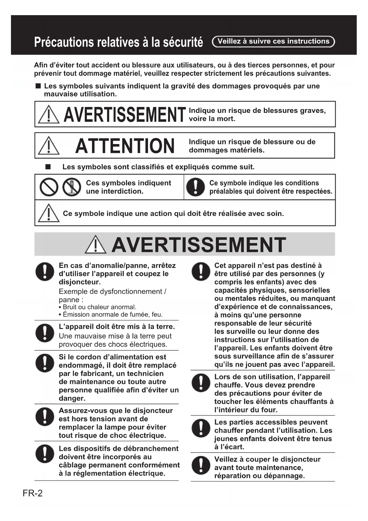 - Avant toute utilisation de cet apparéil, veuillez porter une attention particulière aux « Précautions relatives à la sécurité » (pages FR-2 - 4)