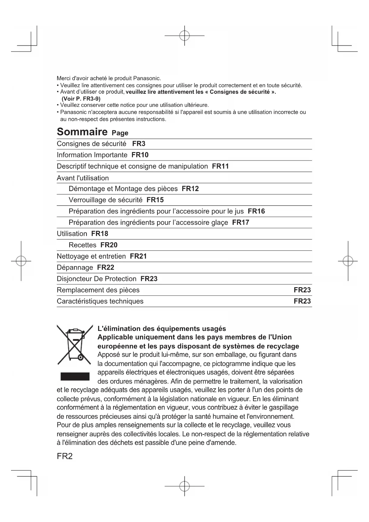 Veillez à nettoyer l'appareil après utilisation, en particulier les surfaces en contact avec les aliments. (Voir P. FR21 « Nettoyage et entretien ») - Ce produit est destiné à un usage domestique uniquement.