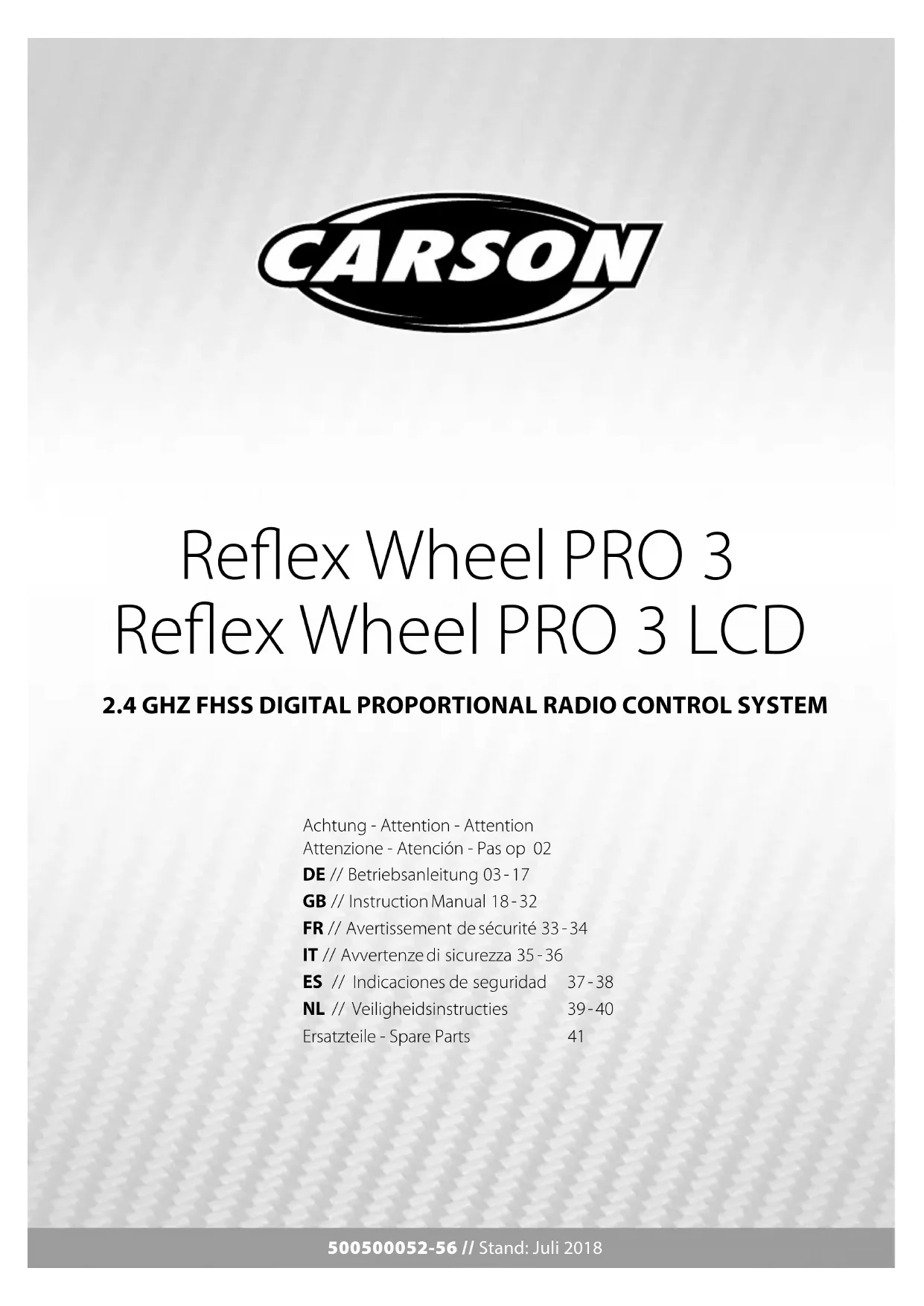 - Les frais d‘élimination, de retour, d’installation, de mise au point et de remise en route du produit Cette garantie vous attribue des droits spécifiques, vous pouvez par ailleurs également prétendre à d’autres droits en fonction du produit par le service après-vente. Avant d’utiliser votre nouvelle télécommande radio, veuillez lire attentivement ces instructions! La société TAMIYA-CARSON Modellbau GmbH & Co. KG atteste que le type d’équipement hertzien 500500052-56 est conforme à la directive 2014/53/EU. Le texte complet de la déclaration de conformité européenne est disponible à l’adresse suivante : www.carson-modelsport.com/de/produkte.htm Signification du symbole sur le produit, l’emballage ou le mode d‘emploi: les appareils électriques sont des biens potentiellement recyclables qui ne doivent pas être jetés aux ordures ménagères une fois usés. Aidez- nous à protéger notre environnement et à économiser nos ressources et remettez cet appareil à un lieu de collecte approprié. Pour toute question, veuillez vous adresser à votre distributeur ou à l‘organisme compétent pour l‘élimintation des déchets. Nous vous souhaitons beaucoup de plaisir avec votre produit de CARSON et bon voyage à tout moment! Déclaration de conformitéFR // 34