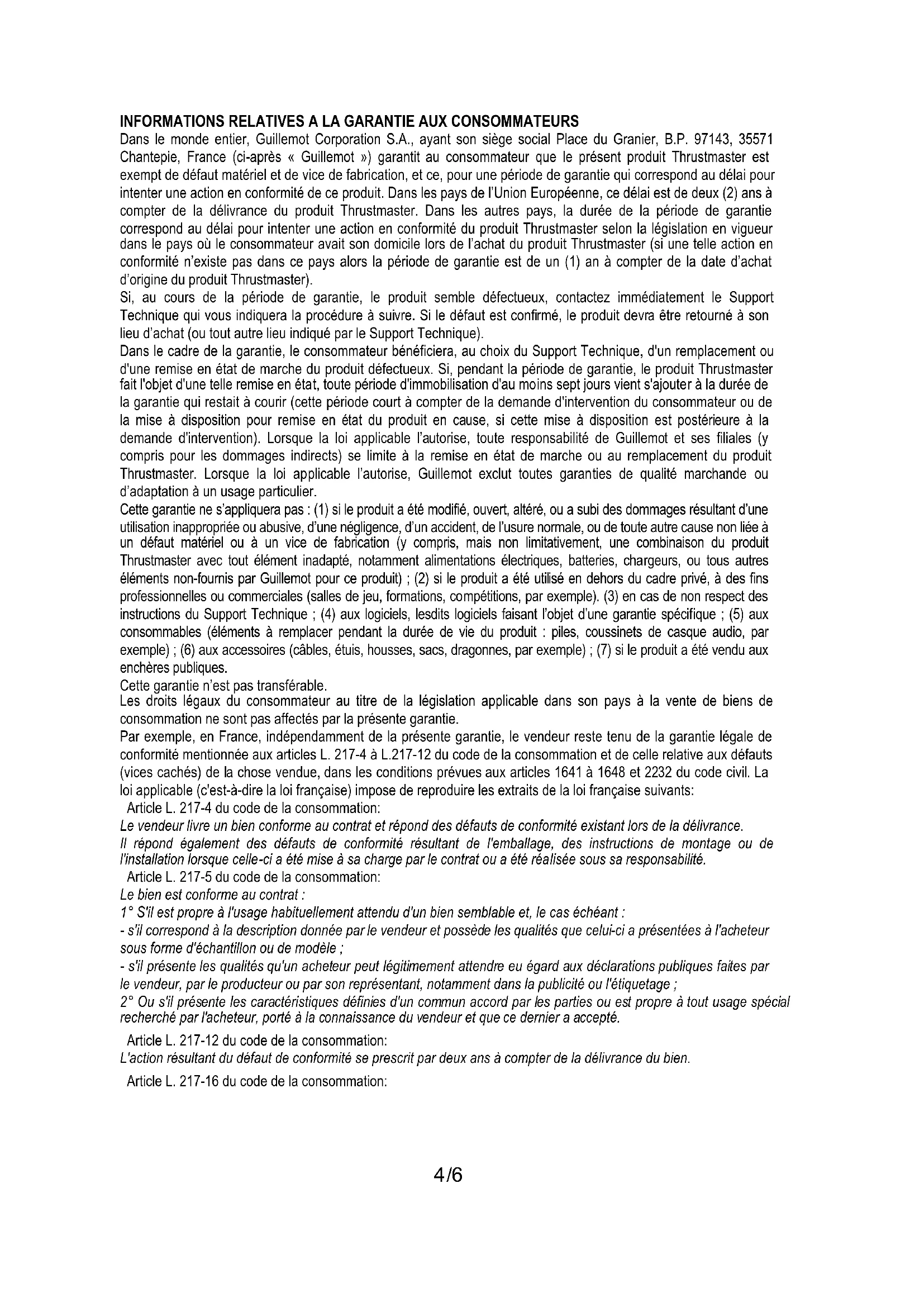 INFORMATIONS RELATIVES A LA GARANTIE AUX CONSOMMATEURS Dans le monde entier, Guillemot Corporation S.A., ayant son siège social Place du Granier, B.P. 97143, 35571 Chantepie, France (ci-après « Guillemot ») garantit au consommateur que le présent produit Thrustmaster est exempt de défaut matériel et de vice de fabrication, et ce, pour une période de garantie qui correspond au délai pour intenter une action en conformité de ce produit. Dans les pays de l’Union Européenne, ce délai est de deux (2) ans à compter de la délivrance du produit Thrustmaster. Dans les autres pays, la durée de la période de garantie correspond au délai pour intenter une action en conformité du produit Thrustmaster selon la législation en vigueur dans le pays où le consommateur avait son domicile lors de l’achat du produit Thrustmaster (si une telle action en conformité n’existe pas dans ce pays alors la période de garantie est de un (1) an à compter de la date d’achat d’origine du produit Thrustmaster). Si, au cours de la période de garantie, le produit semble défectueux, contactez immédiatement le Support Technique qui vous indiquera la procédure à suivre. Si le défaut est confirmé, le produit devra être retourné à son lieu d’achat (ou tout autre lieu indiqué par le Support Technique). Dans le cadre de la garantie, le consommateur bénéficiera, au choix du Support Technique, d'un remplacement ou d'une remise en état de marche du produit défectueux. Si, pendant la période de garantie, le produit Thrustmaster fait l'objet d'une telle remise en état, toute période d'immobilisation d'au moins sept jours vient s'ajouter à la durée de la garantie qui restait à courir (cette période court à compter de la demande d'intervention du consommateur ou de la mise à disposition pour remise en état du produit en cause, si cette mise à disposition est postérieure à la demande d'intervention). Lorsque la loi applicable l’autorise, toute responsabilité de Guillemot et ses filiales (y compris pour les dommages indirects) se limite à la remise en état de marche ou au remplacement du produit Thrustmaster. Lorsque la loi applicable l’autorise, Guillemot exclut toutes garanties de qualité marchande ou d’adaptation à un usage particulier. Cette garantie ne s’appliquera pas : (1) si le produit a été modifié, ouvert, altéré, ou a subi des dommages résultant d’une utilisation inappropriée ou abusive, d’une négligence, d’un accident, de l’usure normale, ou de toute autre cause non liée à un défaut matériel ou à un vice de fabrication (y compris, mais non limitativement, une combinaison du produit Thrustmaster avec tout élément inadapté, notamment alimentations électriques, batteries, chargeurs, ou tous autres éléments non-fournis par Guillemot pour ce produit) ; (2) si le produit a été utilisé en dehors du cadre privé, à des fins professionnelles ou commerciales (salles de jeu, formations, compétitions, par exemple). (3) en cas de non respect des instructions du Support Technique ; (4) aux logiciels, lesdits logiciels faisant l’objet d’une garantie spécifique ; (5) aux consommables (éléments à remplacer pendant la durée de vie du produit : piles, coussinets de casque audio, par exemple) ; (6) aux accessoires (câbles, étuis, housses, sacs, dragonnes, par exemple) ; (7) si le produit a été vendu aux enchères publiques. Cette garantie n’est pas transférable. Les droits légaux du consommateur au titre de la législation applicable dans son pays à la vente de biens de consommation ne sont pas affectés par la présente garantie. Par exemple, en France, indépendamment de la présente garantie, le vendeur reste tenu de la garantie légale de conformité mentionnée aux articles L. 217-4 à L.217-12 du code de la consommation et de celle relative aux défauts (vices cachés) de la chose vendue, dans les conditions prévues aux articles 1641 à 1648 et 2232 du code civil. La loi applicable (c'est-à-dire la loi française) impose de reproduire les extraits de la loi française suivants: Article L. 217-4 du code de la consommation: Le vendeur livre un bien conforme au contrat et répond des défauts de conformité existant lors de la délivrance. Il répond également des défauts de conformité résultant de l'emballage, des instructions de montage ou de l'installation lorsque celle-ci a été mise à sa charge par le contrat ou a été réalisée sous sa responsabilité. Article L. 217-5 du code de la consommation: Le bien est conforme au contrat : 1° S'il est propre à l'usage habituellement attendu d'un bien semblable et, le cas échéant : - s'il correspond à la description donnée par le vendeur et possède les qualités que celui-ci a présentées à l'acheteur sous forme d'échantillon ou de modèle ; - s'il présente les qualités qu'un acheteur peut légitimement attendre eu égard aux déclarations publiques faites par le vendeur, par le producteur ou par son représentant, notamment dans la publicité ou l'étiquetage ; 2° Ou s'il présente les caractéristiques définies d'un commun accord par les parties ou est propre à tout usage spécial recherché par l'acheteur, porté à la connaissance du vendeur et que ce dernier a accepté. Article L. 217-12 du code de la consommation: L'action résultant du défaut de conformité se prescrit par deux ans à compter de la délivrance du bien. Article L. 217-16 du code de la consommation:5