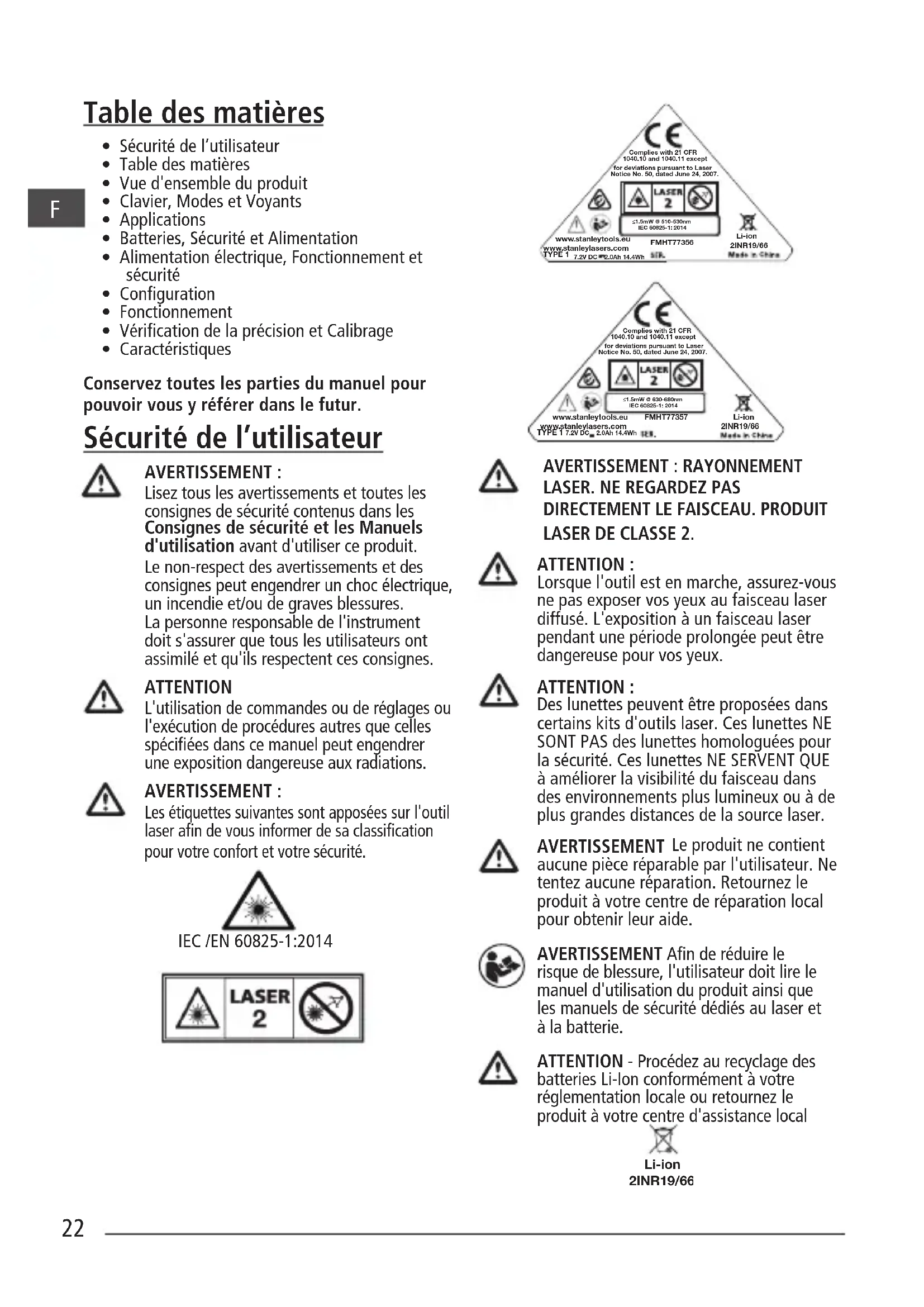 - Sécurité de l’utilisateur• Table des matières• Vue d'ensemble du produit• Clavier, Modes et Voyants• Applications • Batteries, Sécurité et Alimentation• Alimentation électrique, Fonctionnement et sécurité• Conguration• Fonctionnement • Vérication de la précision et Calibrage• CaractéristiquesConservez toutes les parties du manuel pour pouvoir vous yréférer dans le futur. Sécurité de l’utilisateur AVERTISSEMENT :Lisez tous les avertissements et toutes les consignes de sécurité contenus dans les Consignes de sécurité et les Manuels d'utilisation avant d'utiliser ce produit. Le non-respect des avertissements et des consignes peut engendrer un choc électrique, un incendie et/ou de graves blessures. La personne responsable de l'instrument doit s'assurer que tous les utilisateurs ont assimilé et qu'ils respectent ces consignes. ATTENTIONL'utilisation de commandes ou de réglages ou l'exécution de procédures autres que celles spéciées dans ce manuel peut engendrer une exposition dangereuse aux radiations. AVERTISSEMENT :Les étiquettes suivantes sont apposées sur l'outil laser an de vous informer de sa classication pour votre confort et votre sécurité. IEC /EN 60825-1:2014AVERTISSEMENT : RAYONNEMENT LASER. NE REGARDEZ PAS DIRECTEMENT LE FAISCEAU. PRODUIT LASER DE CLASSE 2.ATTENTION: Lorsque l'outil est en marche, assurez-vous ne pas exposer vos yeux au faisceau laser diffusé. L'exposition àun faisceau laser pendant une période prolongée peut être dangereuse pour vos yeux.ATTENTION: Des lunettes peuvent être proposées dans certains kits d'outils laser. Ces lunettes NE SONT PAS des lunettes homologuées pour la sécurité. Ces lunettes NE SERVENT QUE àaméliorer la visibilité du faisceau dans des environnements plus lumineux ou àde plus grandes distances de la source laser.AVERTISSEMENT Le produit ne contient aucune pièce réparable par l'utilisateur. Ne tentez aucune réparation. Retournez le produit àvotre centre de réparation local pour obtenir leur aide. AVERTISSEMENT An de réduire le risque de blessure, l'utilisateur doit lire le manuel d'utilisation du produit ainsi que les manuels de sécurité dédiés au laser et àla batterie.ATTENTION - Procédez au recyclage des batteries Li-Ion conformément àvotre réglementation locale ou retournez le produit àvotre centre d'assistance local 2INR19/66 Li-ion≤1.5mW @ 630-680nmIEC 60825-1: 2014Complies with 21 CFR1040.10 and 1040.11 exceptfor deviations pursuant to LaserNotice No. 50, dated June 24, 2007.FMHT77357www.stanleylasers.comwww.stanleytools.euTYPE 1 7.2V DC 2.0Ah 14.4Wh2INR19/66Li-ion www.stanleytools.eu www.stanleylasers.com TYPE 1 7.2V DC 2.0Ah 14.4Wh FMHT77356 ≤1.5mW @ 510-530nm IEC 60825-1: 2014 Complies with 21 CFR 1040.10 and 1040.11 except for deviations pursuant to Laser Notice No. 50, dated June 24, 2007. Li-ion 2INR19/66