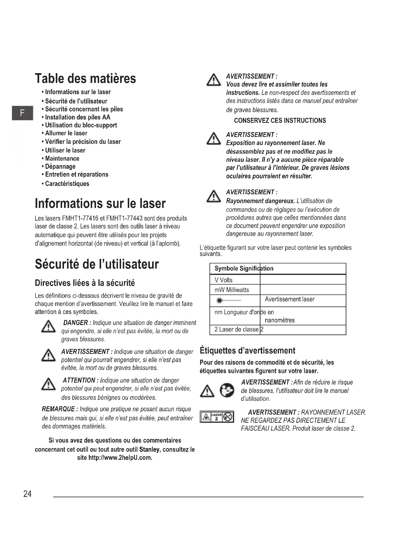 - Caractéristiques Informations sur le laser Les lasers FMHT1-77416 et FMHT1-77443 sont des produits laser de classe 2. Les lasers sont des outils laser à niveau automatique qui peuvent être utilisés pour les projets d’alignement horizontal (de niveau) et vertical (à l’aplomb). Sécurité de l’utilisateur Directives liées à la sécurité Les dénitions ci-dessous décrivent le niveau de gravité de chaque mention d’avertissement. Veuillez lire le manuel et faire attention à ces symboles.
