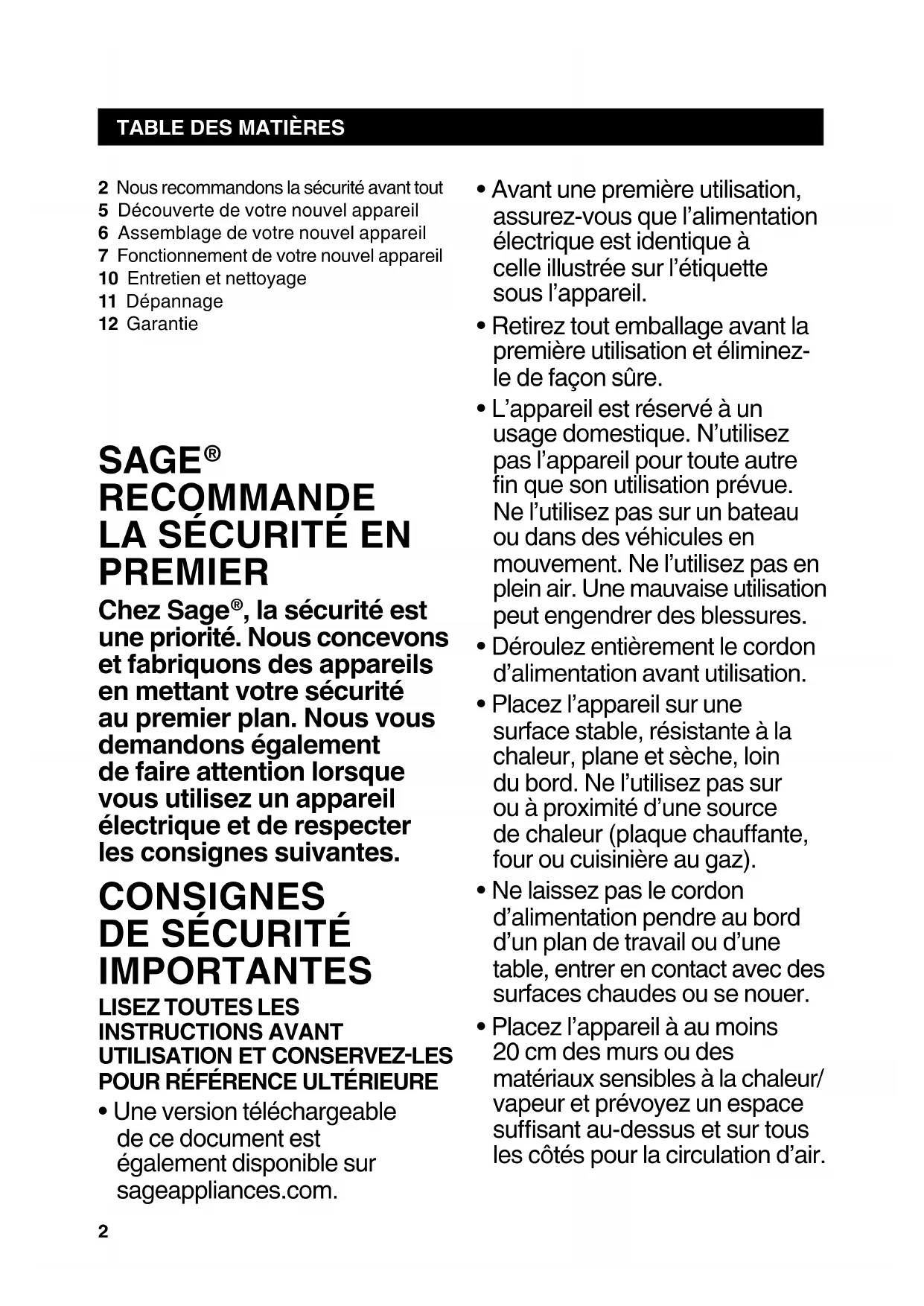 Une version téléchargeable de ce document est également disponible sur sageappliances.com.