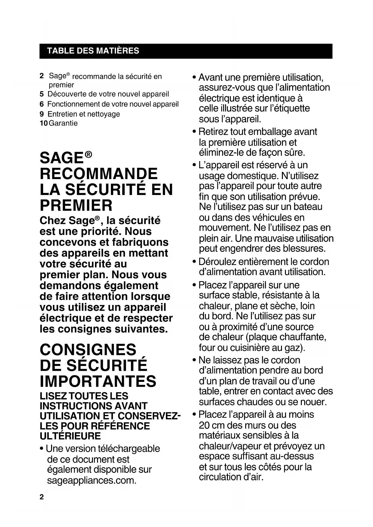 - Une version téléchargeable de ce document est également disponible sur sageappliances.com.