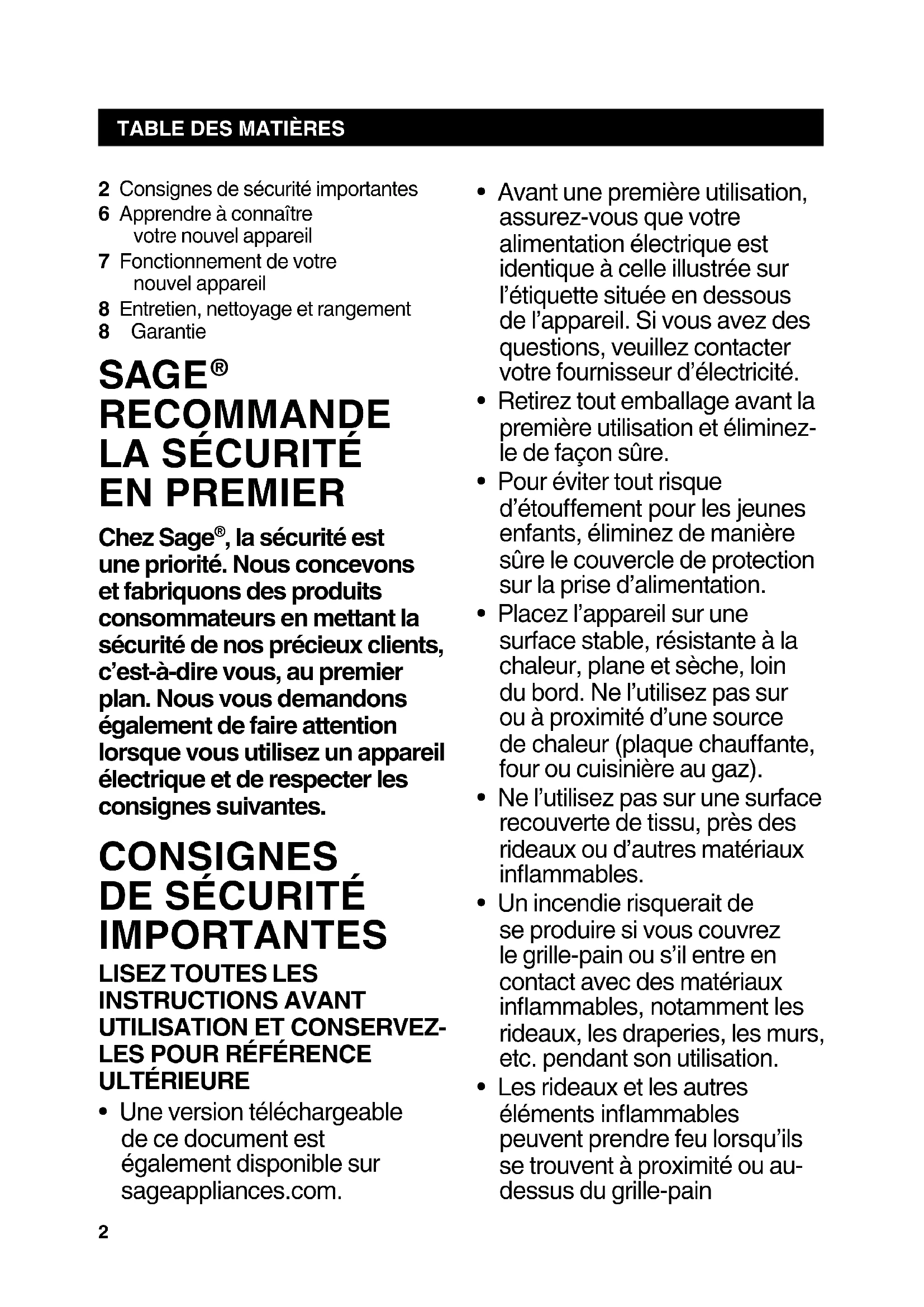- Une version téléchargeable de ce document est également disponible sur sageappliances. com.