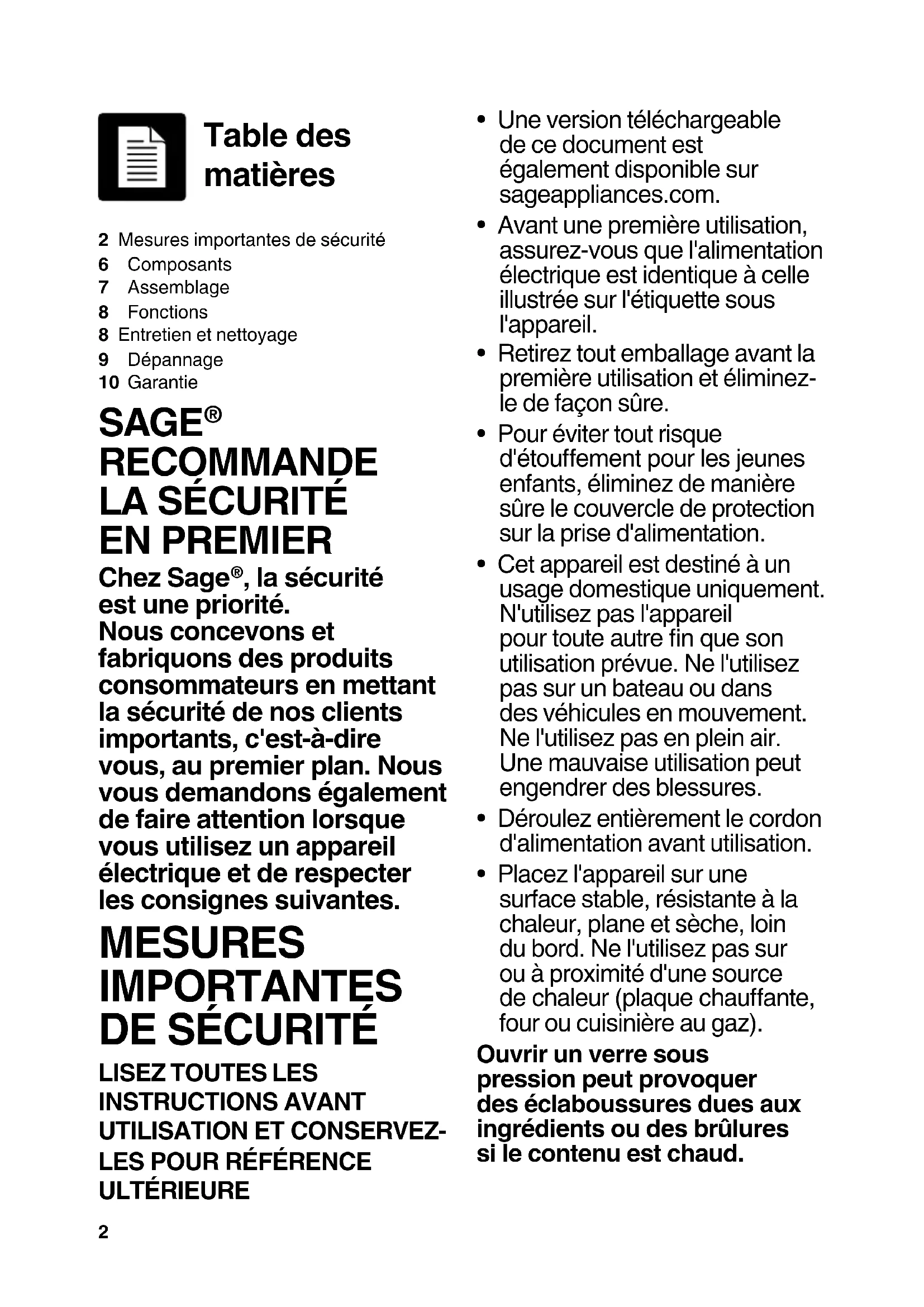 - Une version téléchargeable de ce document est également disponible sur sageappliances.com.