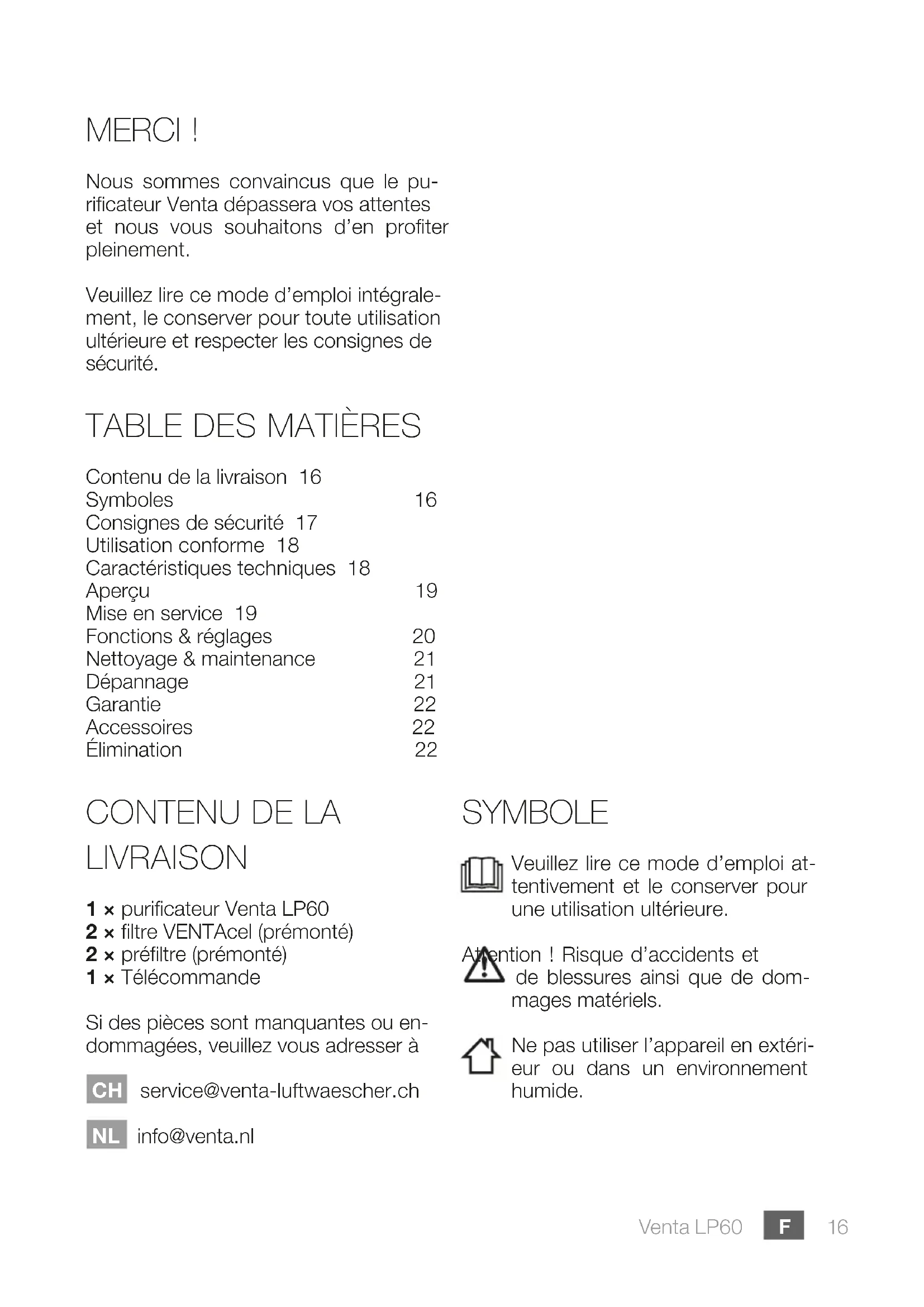 LIVRAISON 1 × puricateur Venta LP60 2 × ltre VENTAcel (prémonté) 2 × préltre (prémonté) 1 × Télécommande Si des pièces sont manquantes ou en- dommagées, veuillez vous adresser à CH service@venta-luftwaescher.ch NL info@venta.nl