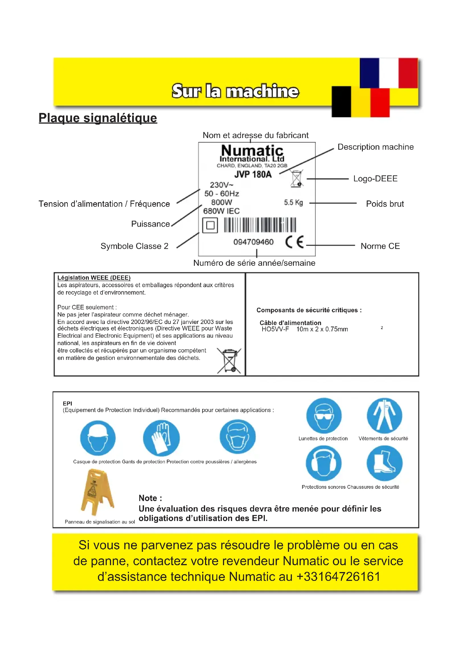 (IEC 60704-2-1) Uncertainty 0.2 dB Class IIProtections sonores Chaussures de sécuritéCasque de protection Gants de protection Protection contre poussières / allergènesLunettes de protectionVêtements de sécurité EPI (Equipement de Protection Individuel) Recommandés pour certaines applications : Note : Une évaluation des risques devra être menée pour dénir les obligations d’utilisation des EPI. Panneau de signalisation au sol Plaque signalétique Législation WEEE (DEEE)Les aspirateurs, accessoires et emballages répondent aux critères de recyclage et d’environnement.Pour CEE seulement :Ne pas jeter l’aspirateur comme déchet ménager.En accord avec la directive 2002/96/EC du 27 janvier 2003 sur les déchets électriques et électroniques (Directive WEEE pour Waste Electrical and Electronic Equipment) et ses applications au niveau national, les aspirateurs en n de vie doivent être collectés et récupérés par un organisme compétent en matière de gestion environnementale des déchets. Nom et adresse du fabricant Logo-DEEE Norme CE Symbole Classe 2 Description machine Numéro de série année/semaine Tension d’alimentation / Fréquence Poids brut Puissance Composants de sécurité critiques : Câble d’alimentation HO5VV-F 10m x 2 x 0.75mm