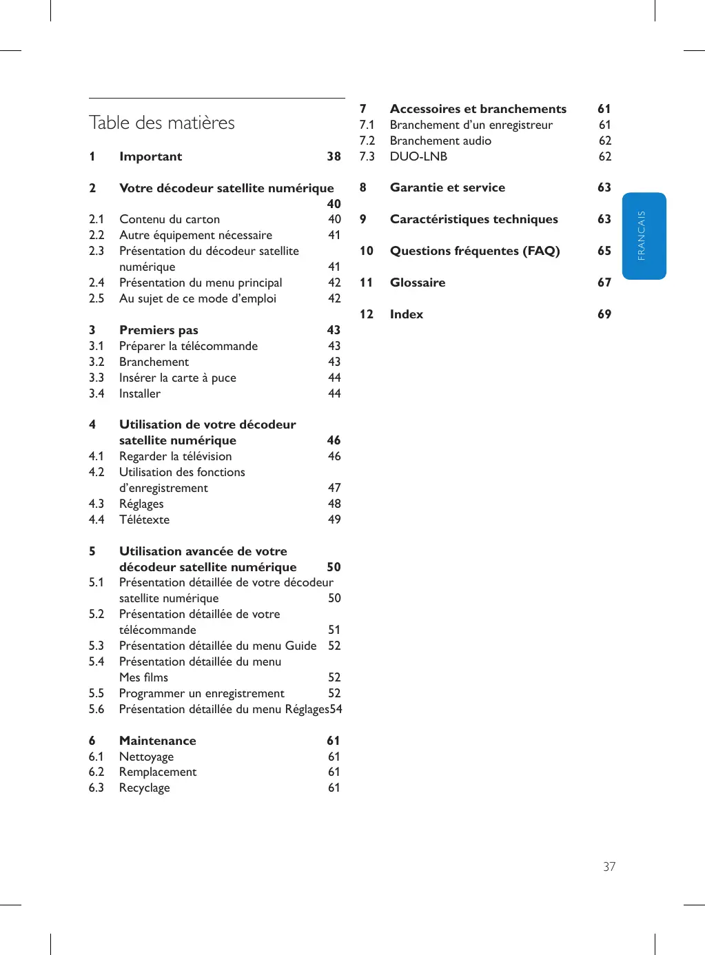 Prenez le temps de lire ce mode d’emploi avant d’utiliser ce décodeur satellite numérique. Ce manuel contient des informations importantes concernant le fonctionnement de votre appareil. Recyclage de votre ancien appareil. Votre produit a été conçu et fabriqué avec des matériaux et des composants de haute qualité qui peuvent être recyclés et réutilisés. Si un produit ou son emballage présente ce symbole avec une poubelle sur roues barrée d’une croix, ceci signifie qu’il tombe sous le coup de la Directive CE 2002/96/CE. Veuillez vous renseigner auprès de votre commune sur le système de tri sélectif mis en place pour les appareils électriques et électroniques. Veuillez respecter les prescriptions en vigueur et ne pas jeter vos appareils hors d'usage à la poubelle comme des déchets ménagers normaux. La mise au rebut de votre ancien appareil contribue à prévenir des conséquences négatives potentielles pour l’environnement et la santé. Le symbole « Recyclage de matériaux » qui figure sur le carton d’emballage et sur le mode d’emploi signalent que ces composants peuvent être recyclés. Ne les jetez donc pas à la poubelle comme des déchets ménagers normaux. Le symbole « Recyclage de matériaux » qui figure sur les éléments d’emballage en matière plastique signale que ces composants sont recyclables. Ne les jetez donc pas à la poubelle comme des déchets ménagers normaux. Le « Point Vert » qui figure sur l’emballage en carton signifie que PHILIPS verse une cotisation financière à l'organisme « Avoidance and Recovery of Packaging waste ».