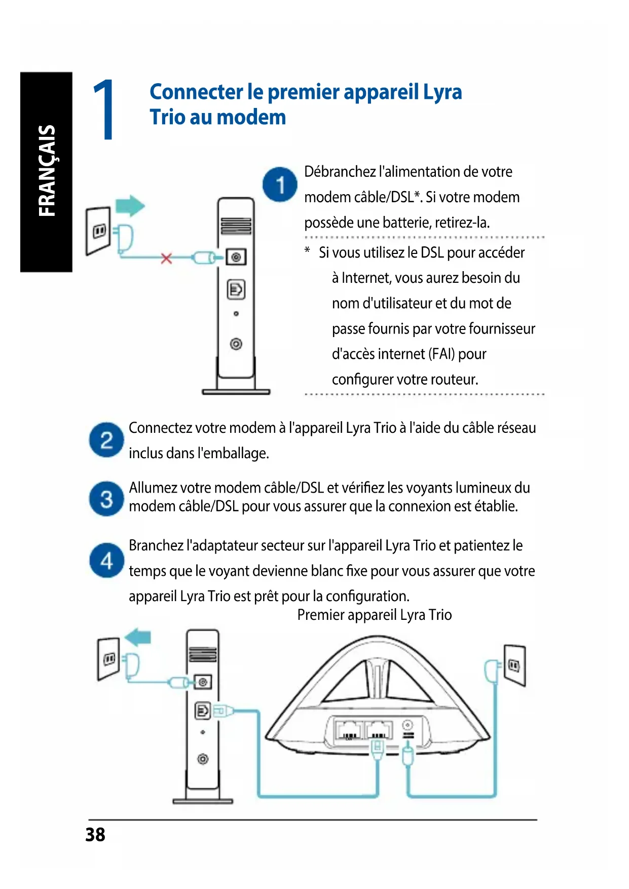 Branchez l'adaptateur secteur sur l'appareil Lyra Trio et patientez le temps que le voyant devienne blanc xe pour vous assurer que votre appareil Lyra Trio est prêt pour la conguration. LAN Premier appareil Lyra Trio39 FRANÇAIS Congurer votre système Wi-Fi Lyra Trio Ouvrez l'application ASUS Lyra sur votre appareil mobile et suivez les instructions.