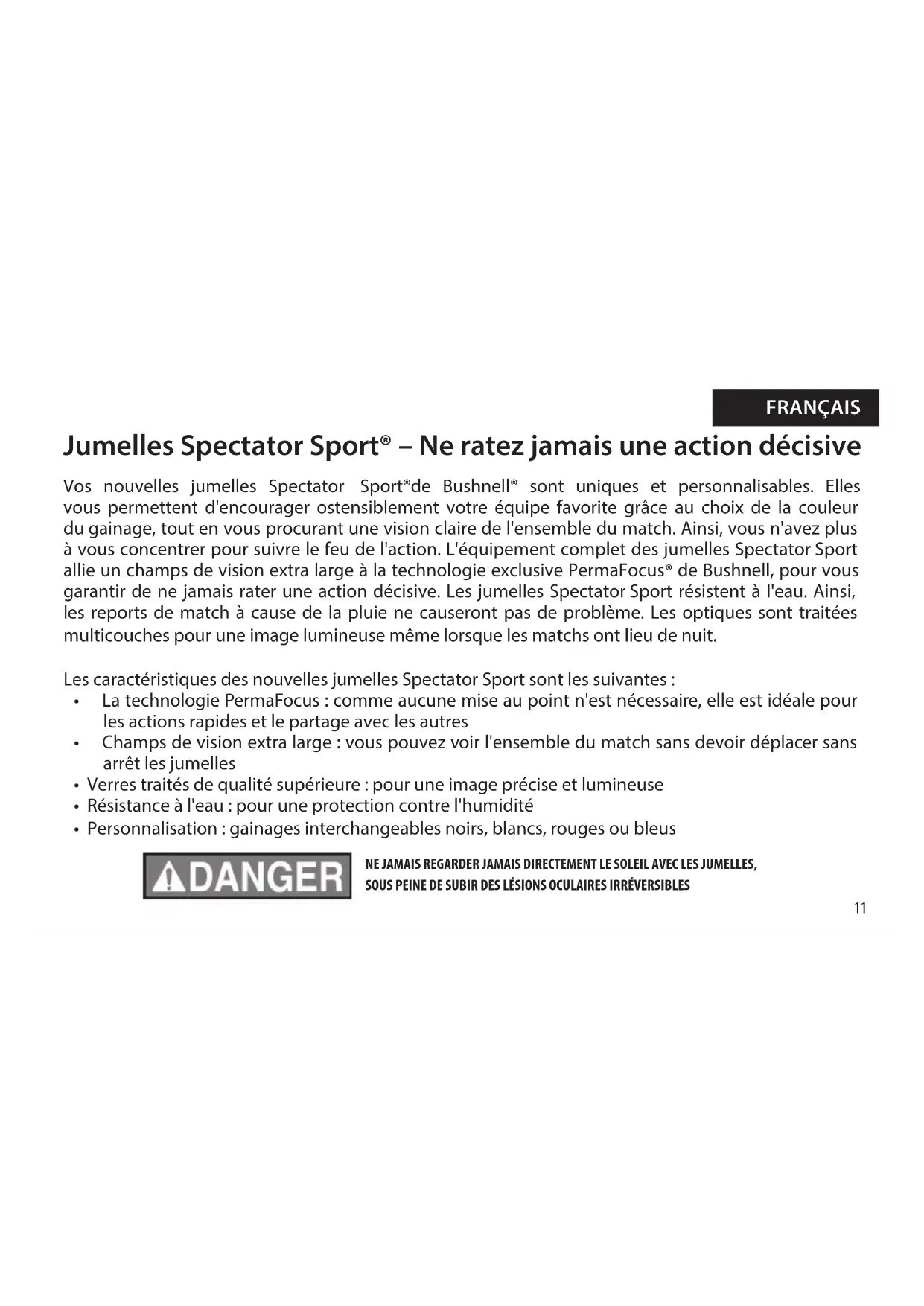 AUX ENFANTS DE MOINS DE 3 ANS. Entretien des optiques Comme pour tout instrument optique de précision, l’entretien adéquat de vos jumelles SpectatorSport ne pourra que contribuer à leur longévité sans faille.