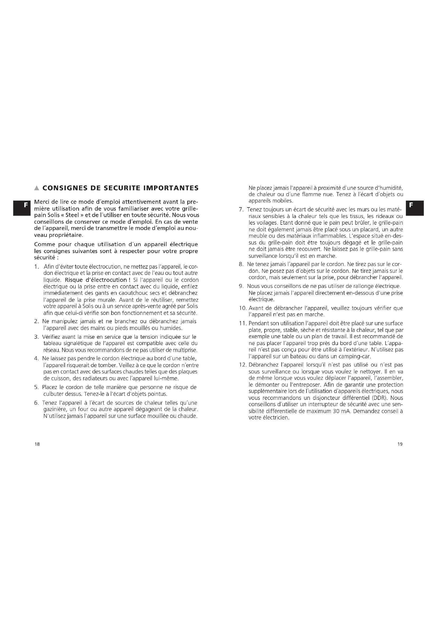 Merci de lire ce mode d´emploi attentivement avant la pre- mière utilisation afin de vous familiariser avec votre grille- pain Solis « Steel » et de l´utiliser en toute sécurité. Nous vous conseillons de conserver ce mode d´emploi. En cas de vente de l´appareil, merci de transmettre le mode d´emploi au nou- veau propriétaire. Comme pour chaque utilisation d´un appareil électrique les consignes suivantes sont à respecter pour votre propre sécurité :