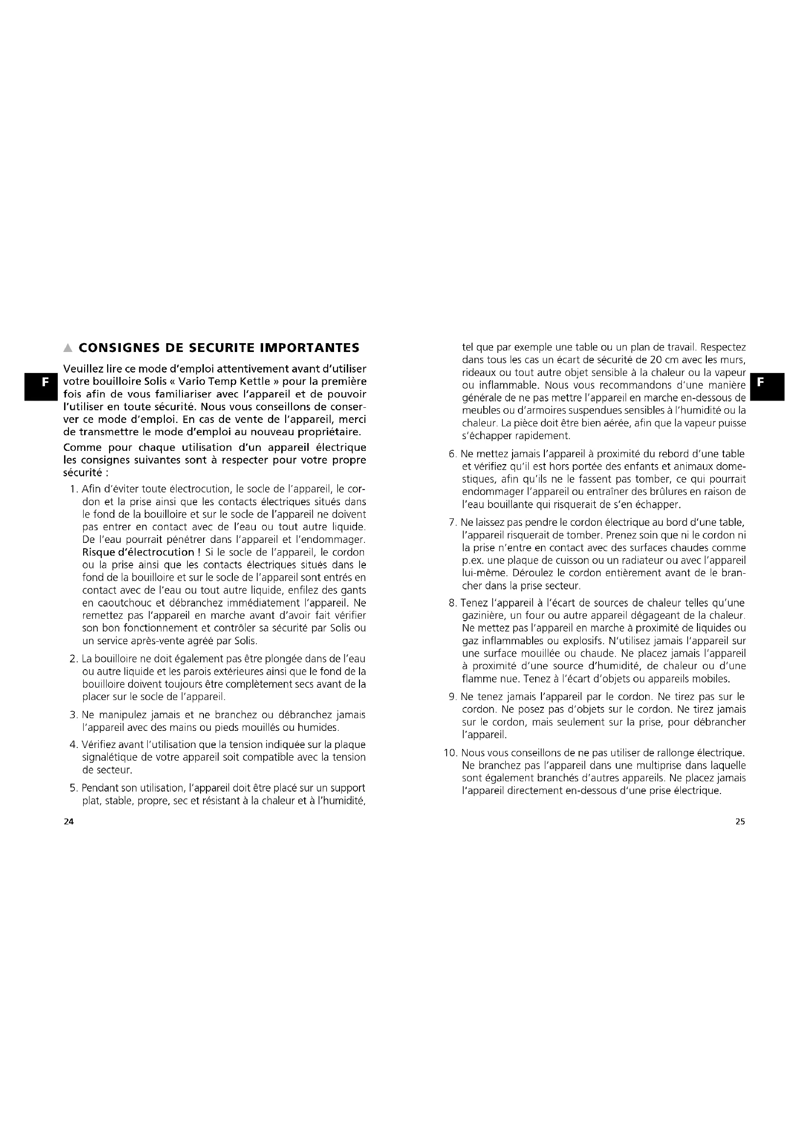 Veuillez lire ce mode d’emploi attentivement avant d’utiliser votre bouilloire Solis « Vario Temp Kettle » pour la première fois afin de vous familiariser avec l’appareil et de pouvoir l’utiliser en toute sécurité. Nous vous conseillons de conser- ver ce mode d’emploi. En cas de vente de l’appareil, merci de transmettre le mode d’emploi au nouveau propriétaire. Comme pour chaque utilisation d’un appareil électrique les consignes suivantes sont à respecter pour votre propre sécurité :