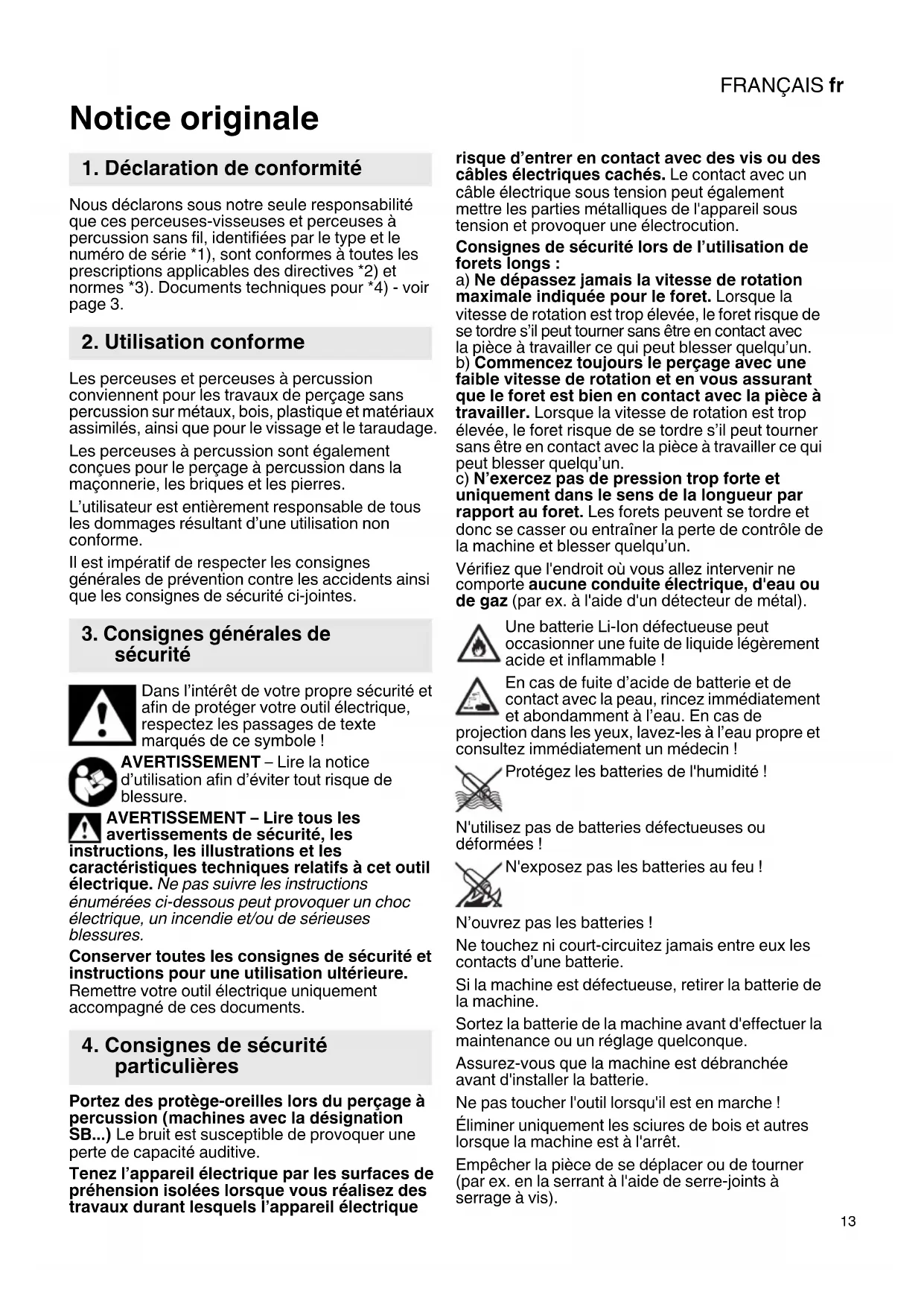 Notice originale Nous déclarons sous notre seule responsabilité que ces perceuses-visseuses et perceuses à percussion sans fil, identifiées par le type et le numéro de série *1), sont conformes à toutes les prescriptions applicables des directives *2) et normes *3). Documents techniques pour *4) - voir page 3. Les perceuses et perceuses à percussion conviennent pour les travaux de perçage sans percussion sur métaux, bois, plastique et matériaux assimilés, ainsi que pour le vissage et le taraudage. Les perceuses à percussion sont également conçues pour le perçage à percussion dans la maçonnerie, les briques et les pierres. L’utilisateur est entièrement responsable de tous les dommages résultant d’une utilisation non conforme. Il est impératif de respecter les consignes générales de prévention contre les accidents ainsi que les consignes de sécurité ci-jointes. Dans l’intérêt de votre propre sécurité et afin de protéger votre outil électrique, respectez les passages de texte marqués de ce symbole ! AVERTISSEMENT – Lire la notice d’utilisation afin d’éviter tout risque de blessure. AVERTISSEMENT – Lire tous les avertissements de sécurité, les instructions, les illustrations et les caractéristiques techniques relatifs à cet outil électrique. Ne pas suivre les instructions énumérées ci-dessous peut provoquer un choc électrique, un incendie et/ou de sérieuses blessures. Conserver toutes les consignes de sécurité et instructions pour une utilisation ultérieure. Remettre votre outil électrique uniquement accompagné de ces documents. Portez des protège-oreilles lors du perçage à percussion (machines avec la désignation SB...) Le bruit est susceptible de provoquer une perte de capacité auditive. Tenez l’appareil électrique par les surfaces de préhension isolées lorsque vous réalisez des travaux durant lesquels l’appareil électrique risque d’entrer en contact avec des vis ou des câbles électriques cachés. Le contact avec un câble électrique sous tension peut également mettre les parties métalliques de l'appareil sous tension et provoquer une électrocution. Consignes de sécurité lors de l’utilisation de forets longs : a) Ne dépassez jamais la vitesse de rotation maximale indiquée pour le foret. Lorsque la vitesse de rotation est trop élevée, le foret risque de se tordre s’il peut tourner sans être en contact avec la pièce à travailler ce qui peut blesser quelqu’un. b) Commencez toujours le perçage avec une faible vitesse de rotation et en vous assurant que le foret est bien en contact avec la pièce à travailler. Lorsque la vitesse de rotation est trop élevée, le foret risque de se tordre s’il peut tourner sans être en contact avec la pièce à travailler ce qui peut blesser quelqu’un. c) N’exercez pas de pression trop forte et uniquement dans le sens de la longueur par rapport au foret. Les forets peuvent se tordre et donc se casser ou entraîner la perte de contrôle de la machine et blesser quelqu’un. Vérifiez que l'endroit où vous allez intervenir ne comporte aucune conduite électrique, d'eau ou de gaz (par ex. à l'aide d'un détecteur de métal). Une batterie Li-Ion défectueuse peut occasionner une fuite de liquide légèrement acide et inflammable ! En cas de fuite d’acide de batterie et de contact avec la peau, rincez immédiatement et abondamment à l’eau. En cas de projection dans les yeux, lavez-les à l’eau propre et consultez immédiatement un médecin ! Protégez les batteries de l'humidité ! N'utilisez pas de batteries défectueuses ou déformées ! N'exposez pas les batteries au feu ! N’ouvrez pas les batteries ! Ne touchez ni court-circuitez jamais entre eux les contacts d’une batterie. Si la machine est défectueuse, retirer la batterie de la machine. Sortez la batterie de la machine avant d'effectuer la maintenance ou un réglage quelconque. Assurez-vous que la machine est débranchée avant d'installer la batterie. Ne pas toucher l'outil lorsqu'il est en marche ! Éliminer uniquement les sciures de bois et autres lorsque la machine est à l'arrêt. Empêcher la pièce de se déplacer ou de tourner (par ex. en la serrant à l'aide de serre-joints à serrage à vis).