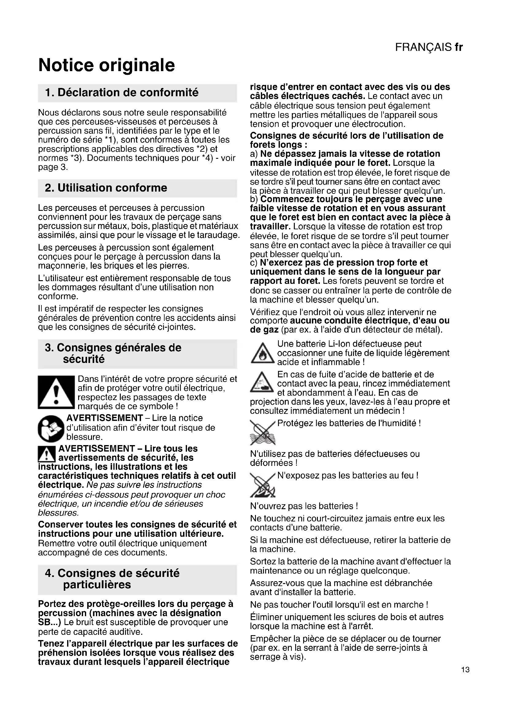 Notice originale Nous déclarons sous notre seule responsabilité que ces perceuses-visseuses et perceuses à percussion sans fil, identifiées par le type et le numéro de série *1), sont conformes à toutes les prescriptions applicables des directives *2) et normes *3). Documents techniques pour *4) - voir page 3. Les perceuses et perceuses à percussion conviennent pour les travaux de perçage sans percussion sur métaux, bois, plastique et matériaux assimilés, ainsi que pour le vissage et le taraudage. Les perceuses à percussion sont également conçues pour le perçage à percussion dans la maçonnerie, les briques et les pierres. L’utilisateur est entièrement responsable de tous les dommages résultant d’une utilisation non conforme. Il est impératif de respecter les consignes générales de prévention contre les accidents ainsi que les consignes de sécurité ci-jointes. Dans l’intérêt de votre propre sécurité et afin de protéger votre outil électrique, respectez les passages de texte marqués de ce symbole ! AVERTISSEMENT – Lire la notice d’utilisation afin d’éviter tout risque de blessure. AVERTISSEMENT – Lire tous les avertissements de sécurité, les instructions, les illustrations et les caractéristiques techniques relatifs à cet outil électrique. Ne pas suivre les instructions énumérées ci-dessous peut provoquer un choc électrique, un incendie et/ou de sérieuses blessures. Conserver toutes les consignes de sécurité et instructions pour une utilisation ultérieure. Remettre votre outil électrique uniquement accompagné de ces documents. Portez des protège-oreilles lors du perçage à percussion (machines avec la désignation SB...) Le bruit est susceptible de provoquer une perte de capacité auditive. Tenez l’appareil électrique par les surfaces de préhension isolées lorsque vous réalisez des travaux durant lesquels l’appareil électrique risque d’entrer en contact avec des vis ou des câbles électriques cachés. Le contact avec un câble électrique sous tension peut également mettre les parties métalliques de l'appareil sous tension et provoquer une électrocution. Consignes de sécurité lors de l’utilisation de forets longs : a) Ne dépassez jamais la vitesse de rotation maximale indiquée pour le foret. Lorsque la vitesse de rotation est trop élevée, le foret risque de se tordre s’il peut tourner sans être en contact avec la pièce à travailler ce qui peut blesser quelqu’un. b) Commencez toujours le perçage avec une faible vitesse de rotation et en vous assurant que le foret est bien en contact avec la pièce à travailler. Lorsque la vitesse de rotation est trop élevée, le foret risque de se tordre s’il peut tourner sans être en contact avec la pièce à travailler ce qui peut blesser quelqu’un. c) N’exercez pas de pression trop forte et uniquement dans le sens de la longueur par rapport au foret. Les forets peuvent se tordre et donc se casser ou entraîner la perte de contrôle de la machine et blesser quelqu’un. Vérifiez que l'endroit où vous allez intervenir ne comporte aucune conduite électrique, d'eau ou de gaz (par ex. à l'aide d'un détecteur de métal). Une batterie Li-Ion défectueuse peut occasionner une fuite de liquide légèrement acide et inflammable ! En cas de fuite d’acide de batterie et de contact avec la peau, rincez immédiatement et abondamment à l’eau. En cas de projection dans les yeux, lavez-les à l’eau propre et consultez immédiatement un médecin ! Protégez les batteries de l'humidité ! N'utilisez pas de batteries défectueuses ou déformées ! N'exposez pas les batteries au feu ! N’ouvrez pas les batteries ! Ne touchez ni court-circuitez jamais entre eux les contacts d’une batterie. Si la machine est défectueuse, retirer la batterie de la machine. Sortez la batterie de la machine avant d'effectuer la maintenance ou un réglage quelconque. Assurez-vous que la machine est débranchée avant d'installer la batterie. Ne pas toucher l'outil lorsqu'il est en marche ! Éliminer uniquement les sciures de bois et autres lorsque la machine est à l'arrêt. Empêcher la pièce de se déplacer ou de tourner (par ex. en la serrant à l'aide de serre-joints à serrage à vis).
