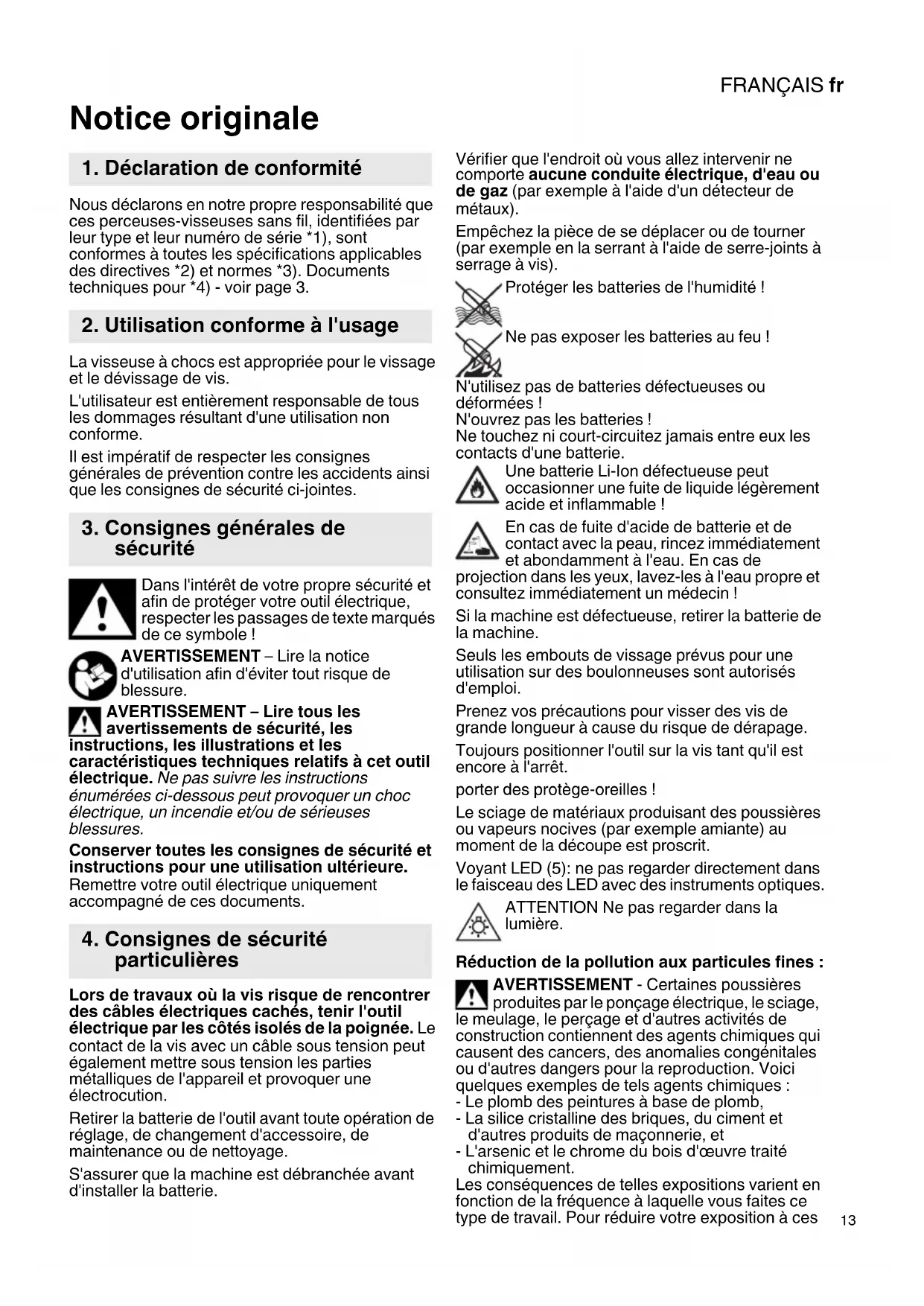 Notice originale Nous déclarons en notre propre responsabilité que ces perceuses-visseuses sans fil, identifiées par leur type et leur numéro de série *1), sont conformes à toutes les spécifications applicables des directives *2) et normes *3). Documents techniques pour *4) - voir page 3. La visseuse à chocs est appropriée pour le vissage et le dévissage de vis. L'utilisateur est entièrement responsable de tous les dommages résultant d'une utilisation non conforme. Il est impératif de respecter les consignes générales de prévention contre les accidents ainsi que les consignes de sécurité ci-jointes. Dans l'intérêt de votre propre sécurité et afin de protéger votre outil électrique, respecter les passages de texte marqués de ce symbole ! AVERTISSEMENT – Lire la notice d'utilisation afin d'éviter tout risque de blessure. AVERTISSEMENT – Lire tous les avertissements de sécurité, les instructions, les illustrations et les caractéristiques techniques relatifs à cet outil électrique. Ne pas suivre les instructions énumérées ci-dessous peut provoquer un choc électrique, un incendie et/ou de sérieuses blessures. Conserver toutes les consignes de sécurité et instructions pour une utilisation ultérieure. Remettre votre outil électrique uniquement accompagné de ces documents. Lors de travaux où la vis risque de rencontrer des câbles électriques cachés, tenir l'outil électrique par les côtés isolés de la poignée.