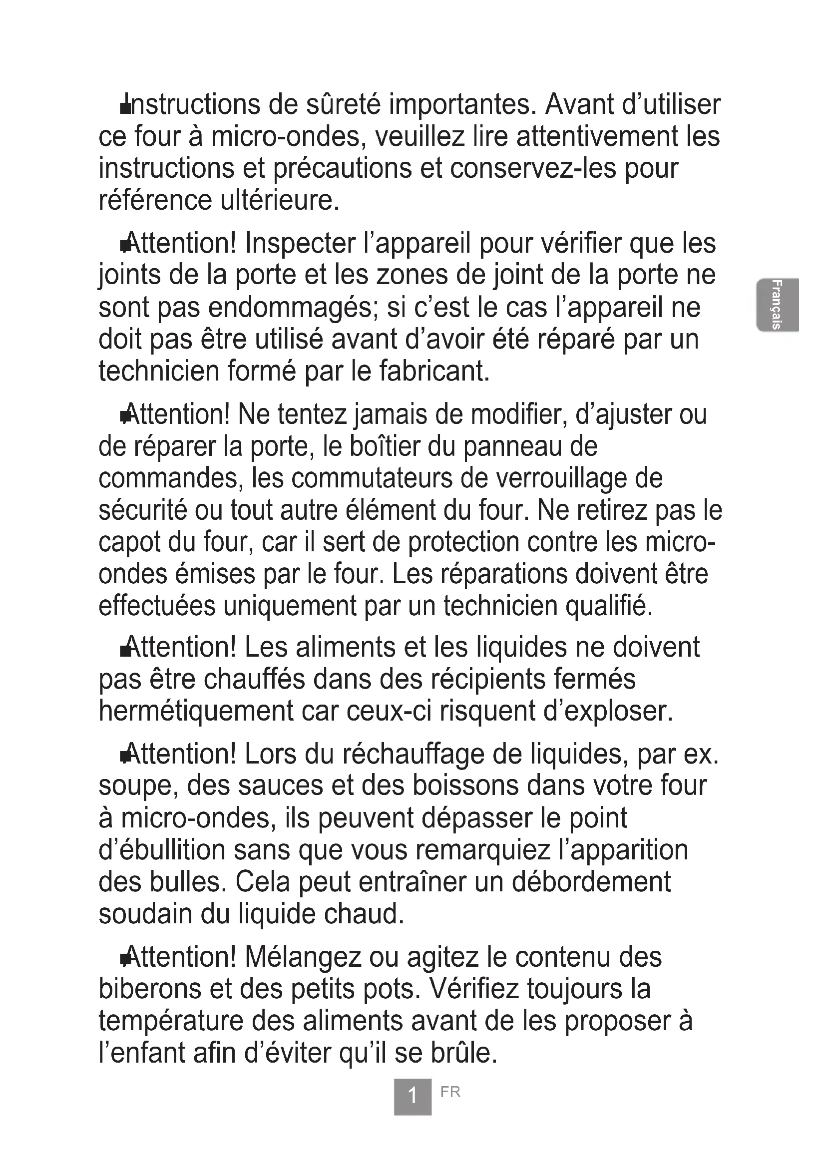 Instructions de sûreté importantes. Avant d’utiliser ce four à micro-ondes, veuillez lire attentivement les instructions et précautions et conservez-les pour référence ultérieure.