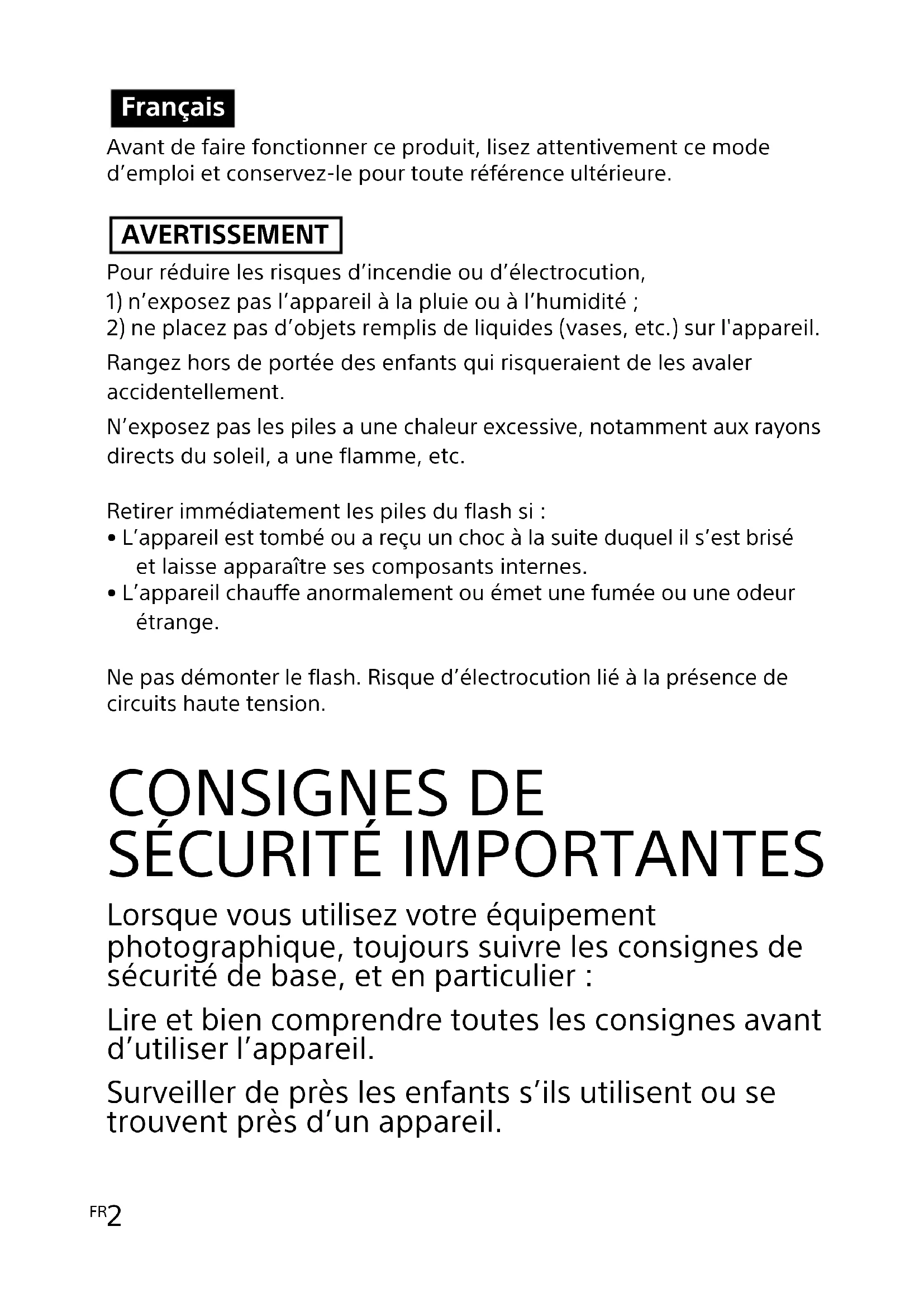 Rangez hors de portée des enfants qui risqueraient de les avaler accidentellement. N’exposez pas les piles a une chaleur excessive, notamment aux rayons directs du soleil, a une flamme, etc. Retirer immédiatement les piles du flash si :