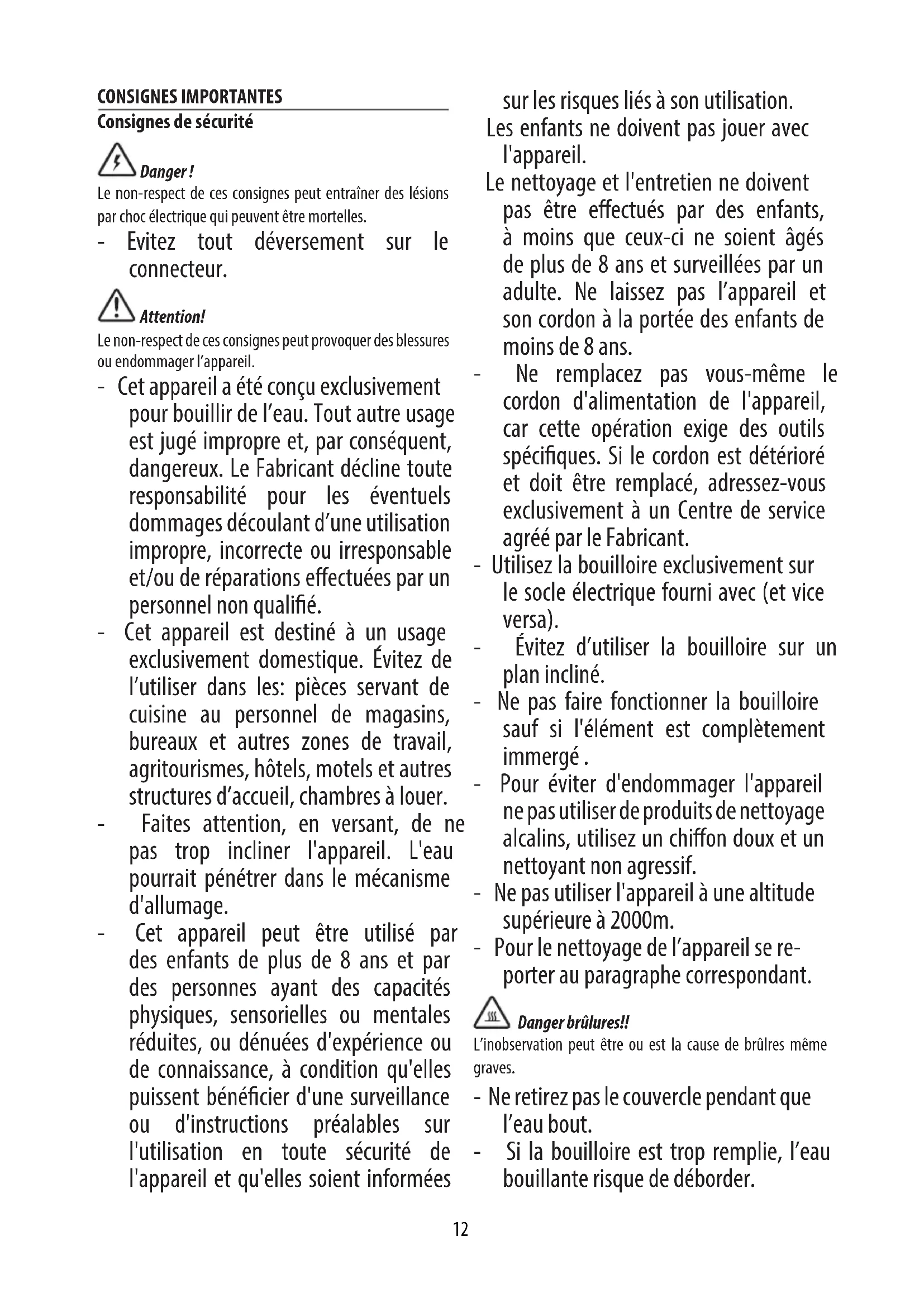 CONSIGNES IMPORTANTES Consignes de sécurité Danger ! Le non-respect de ces consignes peut entraîner des lésions par choc électrique qui peuvent être mortelles. - Evitez tout déversement sur le connecteur. Attention! Le non-respect de ces consignes peut provoquer des blessures ou endommager l’appareil. - Cet appareil a été conçu exclusivement pour bouillir de l’eau. Tout autre usage est jugé impropre et, par conséquent, dangereux. Le Fabricant décline toute responsabilité pour les éventuels dommages découlant d’une utilisation impropre, incorrecte ou irresponsable et/ou de réparations eectuées par un personnel non qualié. - Cet appareil est destiné à un usage exclusivement domestique. Évitez de l’utiliser dans les: pièces servant de cuisine au personnel de magasins, bureaux et autres zones de travail, agritourismes, hôtels, motels et autres structures d’accueil, chambres à louer. - Faites attention, en versant, de ne pas trop incliner l'appareil. L'eau pourrait pénétrer dans le mécanisme d'allumage. - Cet appareil peut être utilisé par des enfants de plus de 8 ans et par des personnes ayant des capacités physiques, sensorielles ou mentales réduites, ou dénuées d'expérience ou de connaissance, à condition qu'elles puissent bénécier d'une surveillance ou d'instructions préalables sur l'utilisation en toute sécurité de l'appareil et qu'elles soient informées sur les risques liés à son utilisation. Les enfants ne doivent pas jouer avec l'appareil. Le nettoyage et l'entretien ne doivent pas être eectués par des enfants, à moins que ceux-ci ne soient âgés de plus de 8 ans et surveillées par un adulte. Ne laissez pas l’appareil et son cordon à la portée des enfants de moins de 8 ans. - Ne remplacez pas vous-même le cordon d'alimentation de l'appareil, car cette opération exige des outils spéciques. Si le cordon est détérioré et doit être remplacé, adressez-vous exclusivement à un Centre de service agréé par le Fabricant. - Utilisez la bouilloire exclusivement sur le socle électrique fourni avec (et vice versa). - Évitez d’utiliser la bouilloire sur un plan incliné. - Ne pas faire fonctionner la bouilloire sauf si l'élément est complètement immergé . - Pour éviter d'endommager l'appareil ne pas utiliser de produits de nettoyage alcalins, utilisez un chion doux et un nettoyant non agressif. - Ne pas utiliser l'appareil à une altitude supérieure à 2000m. - Pour le nettoyage de l’appareil se re- porter au paragraphe correspondant. Danger brûlures!! L’inobservation peut être ou est la cause de brûlres même graves. - Ne retirez pas le couvercle pendant que l’eau bout. - Si la bouilloire est trop remplie, l’eau bouillante risque de déborder.12
