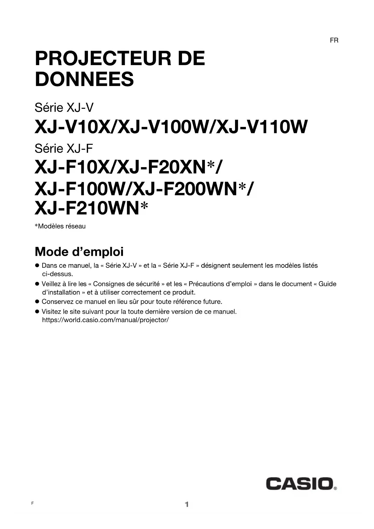 PROJECTEUR DE DONNEES Série XJ-V XJ-V10X/XJ-V100W/XJ-V110W Série XJ-F XJ-F10X/XJ-F20XN*/ XJ-F100W/XJ-F200WN*/ XJ-F210WN* Mode d’emploi Dans ce manuel, la « Série XJ-V » et la « Série XJ-F » désignent seulement les modèles listés ci-dessus. Veillez à lire les « Consignes de sécurité » et les « Précautions d’emploi » dans le document « Guide d’installation » et à utiliser correctement ce produit. Conservez ce manuel en lieu sûr pour toute référence future. Visitez le site suivant pour la toute dernière version de ce manuel. https://world.casio.com/manual/projector/ *Modèles réseau