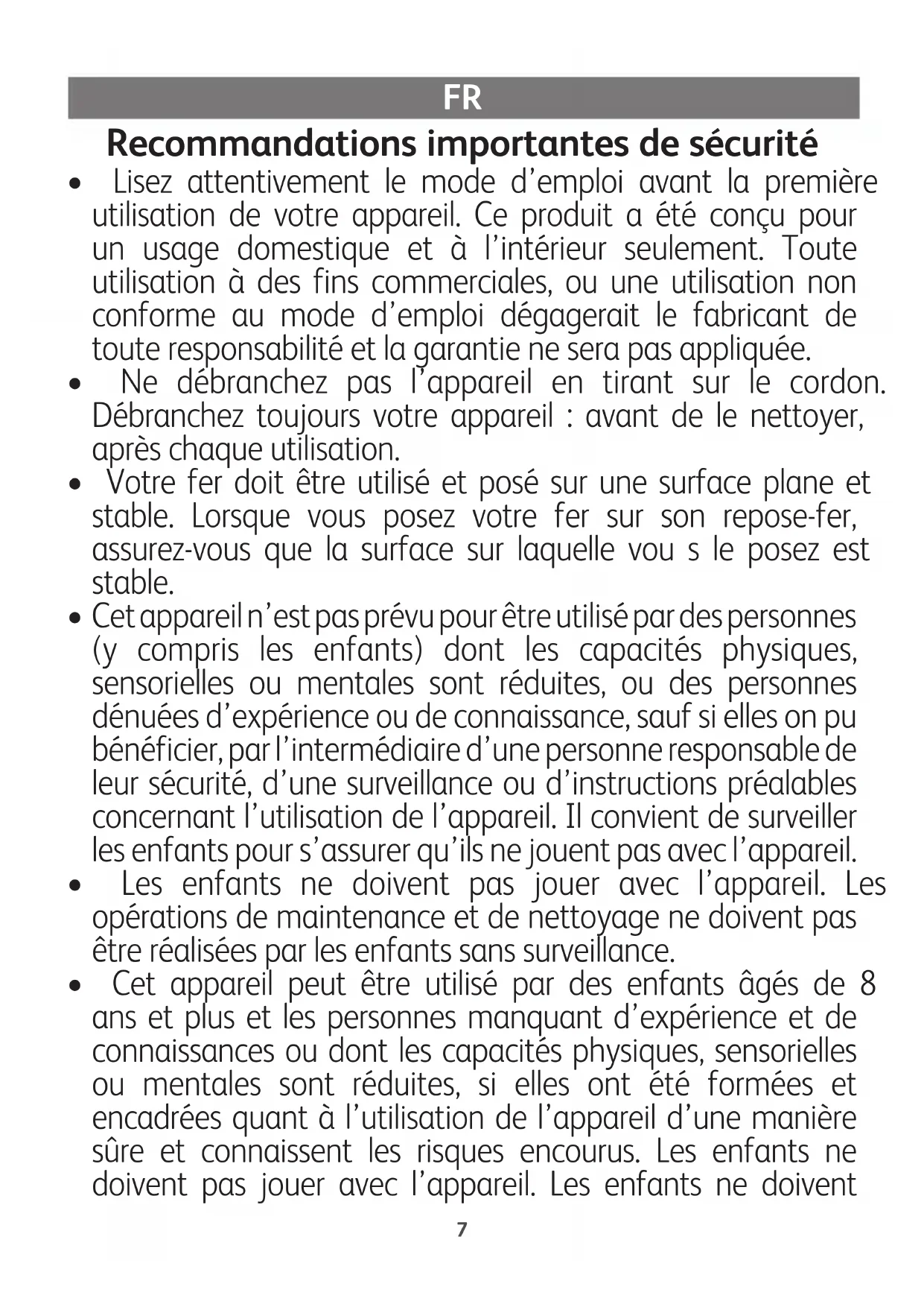 - Cet appareil peut être utilisé par des enfants âgés de 8 ans et plus et les personnes manquant d’expérience et de connaissances ou dont les capacités physiques, sensorielles ou mentales sont réduites, si elles ont été formées et encadrées quant à l’utilisation de l’appareil d’une manière sûre et connaissent les risques encourus. Les enfants ne doivent pas jouer avec l’appareil. Les enfants ne doivent8 ni nettoyer l’appareil ni s’occuper de son entretien sans surveillance. Gardez le fer et le cordon hors de la portée des enfants de moins de 8 ans lorsque le fer est sous tension ou en cours de refroidissement.