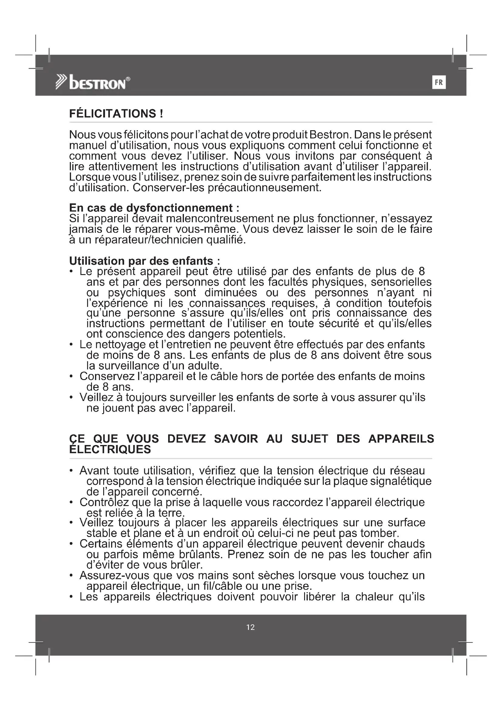 Nos félicitations pour l'achat de votre produit Bestron. Dans le présent manuel d'utilisation, nous vous expliquons comment il fonctionne et comment vous pouvez l'utiliser. Nous vous invitons par conséquent à lire attentivement les instructions d'utilisation avant d'utiliser l'appareil. Lorsque vous l'utilisez, prenez soin de suivre parfaitement les instructions d'utilisation. Conservez-les précautionneusement.