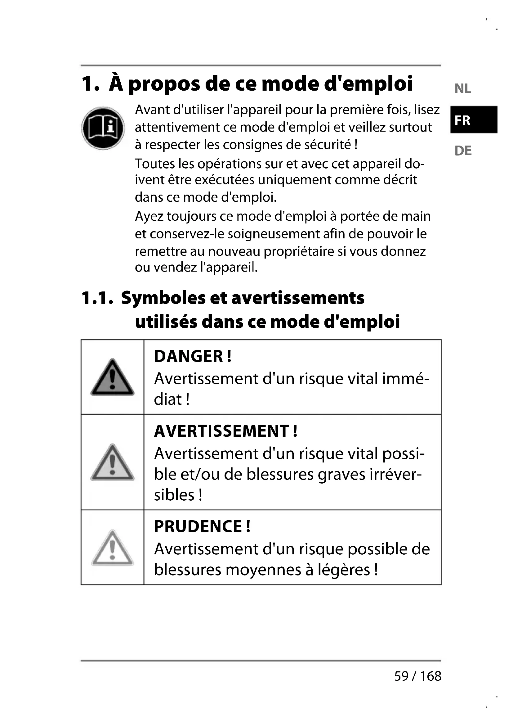 1.1. Symboles et avertissements utilisés dans ce mode d'emploi .......................................................59 1.2. Utilisation conforme ............................................ 60