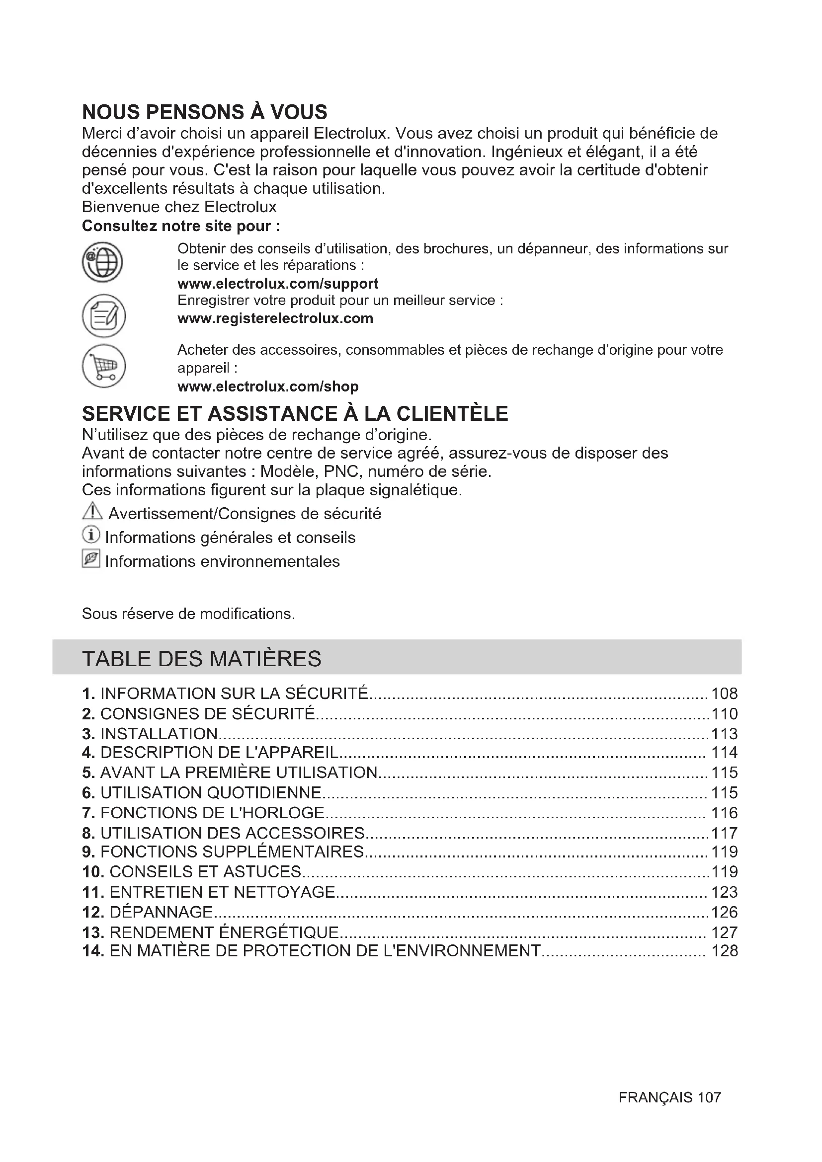 Merci d’avoir choisi un appareil Electrolux. Vous avez choisi un produit qui bénéficie de décennies d'expérience professionnelle et d'innovation. Ingénieux et élégant, il a été pensé pour vous. C'est la raison pour laquelle vous pouvez avoir la certitude d'obtenir d'excellents résultats à chaque utilisation. Bienvenue chez Electrolux Consultez notre site pour : Obtenir des conseils d’utilisation, des brochures, un dépanneur, des informations sur le service et les réparations : www.electrolux.com/support Enregistrer votre produit pour un meilleur service : www.registerelectrolux.com Acheter des accessoires, consommables et pièces de rechange d’origine pour votre appareil : www.electrolux.com/shop