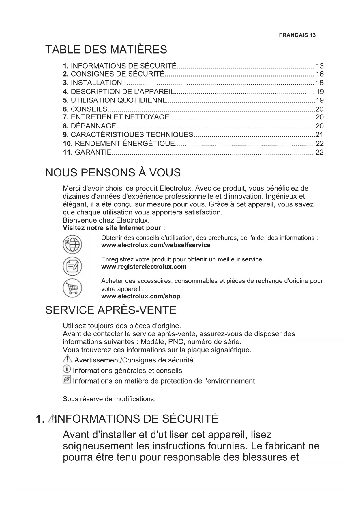 Merci d'avoir choisi ce produit Electrolux. Avec ce produit, vous bénéficiez de dizaines d'années d'expérience professionnelle et d'innovation. Ingénieux et élégant, il a été conçu sur mesure pour vous. Grâce à cet appareil, vous savez que chaque utilisation vous apportera satisfaction. Bienvenue chez Electrolux. Visitez notre site Internet pour : Obtenir des conseils d'utilisation, des brochures, de l'aide, des informations : www.electrolux.com/webselfservice Enregistrez votre produit pour obtenir un meilleur service : www.registerelectrolux.com Acheter des accessoires, consommables et pièces de rechange d'origine pour votre appareil : www.electrolux.com/shop