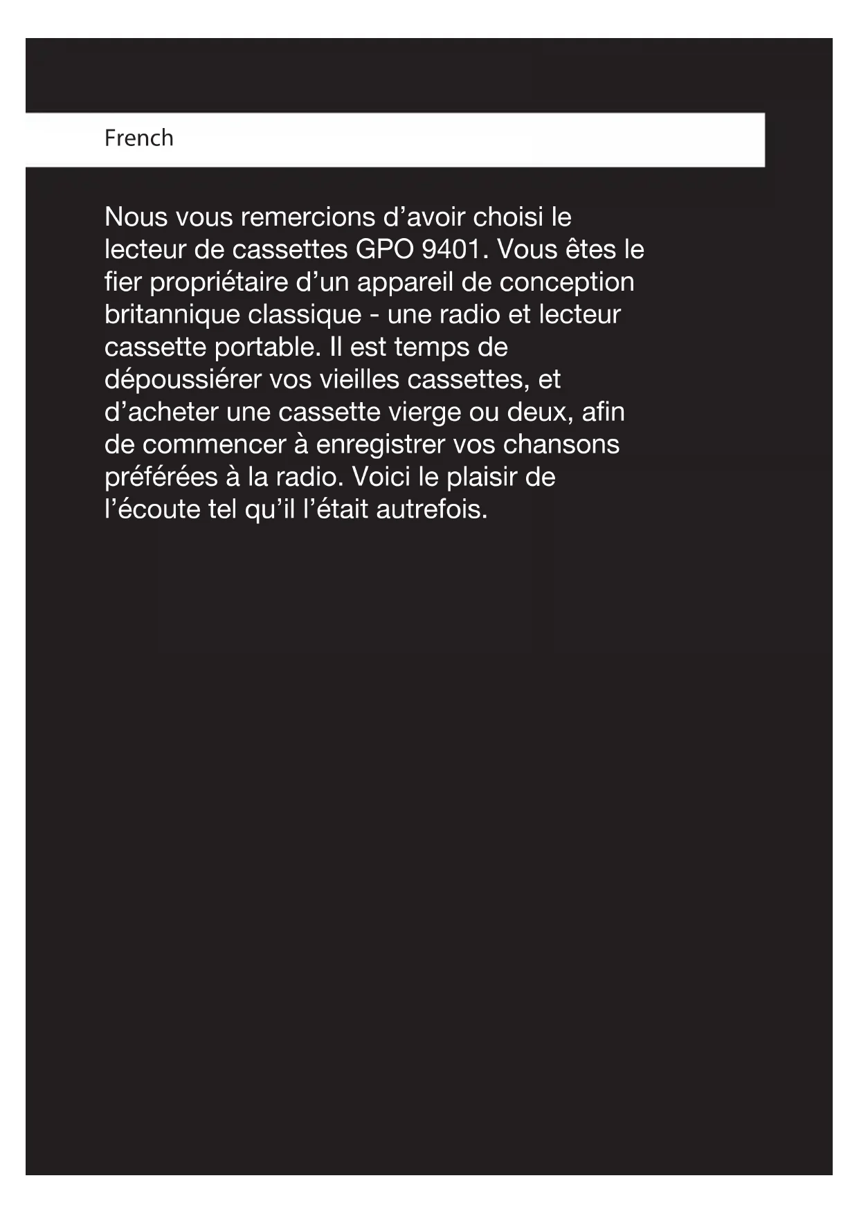 Nous vous remercions d'avoir choisi le lecteur de cassettes GPO 9401. Vous êtes le fier propriétaire d'un appareil de conception Britannique classique - une radio et lecteur cassette portable. Il est temps de dépoussiérer vos vieilles cassettes, et d'acheter une cassette vierge ou deux, afin de commencer à enregistrer vos chansons préférées à la radio. Voici le. Plaisir de l'écoute tel qu'il l'était autrefois.