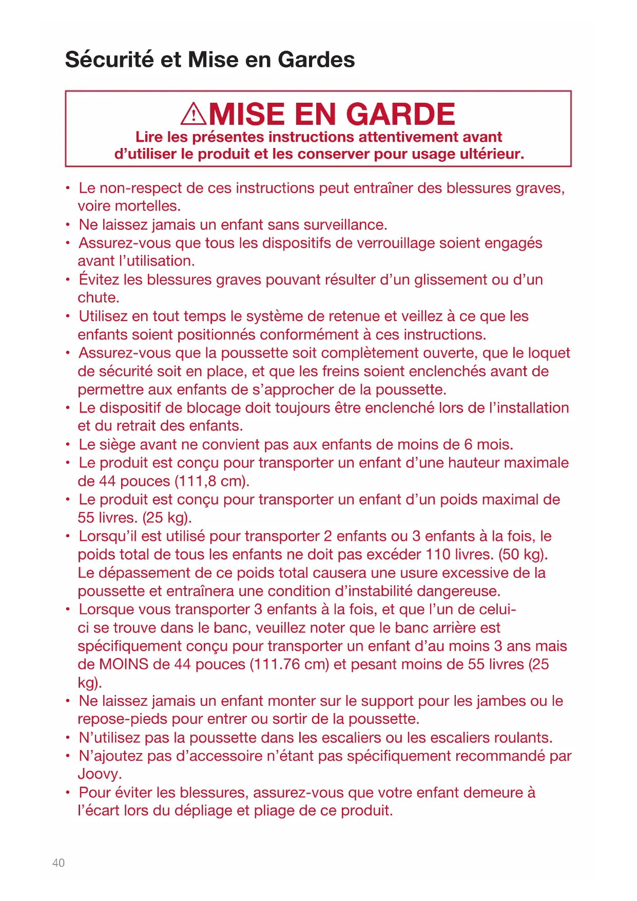 - Le siège peut être placé sur la poussette face vers l’avant ou face vers l’arrière. IMISE EN GARDE: Utilisez UNIQUEMENT sur la poussette Joovy Qool. Le produit est conçu pour transporter un enfant d’une hauteur maximale de 44 pouces (111,8 cm). Le produit est conçu pour transporter un enfant d’un poids maximal de 55 livres. (25 kg). Lorsqu’il est utilisé pour transporter 2 enfants ou 3 enfants en même temps, le poids total de tous les enfants ne doit pas dépasser 110 livres. (50 kg). Le dépassement de ce poids total causera une usure excessive de la poussette et entraînera une condition d’instabilité dangereuse. Ne laissez jamais un enfant sans surveillance. Évitez les blessures graves pouvant être causées par une chute ou un glissement. Toujours utiliser le système de retenue. Ce produit n’est pas un jouet. Ne laissez pas les enfants jouer avec celui-ci.61