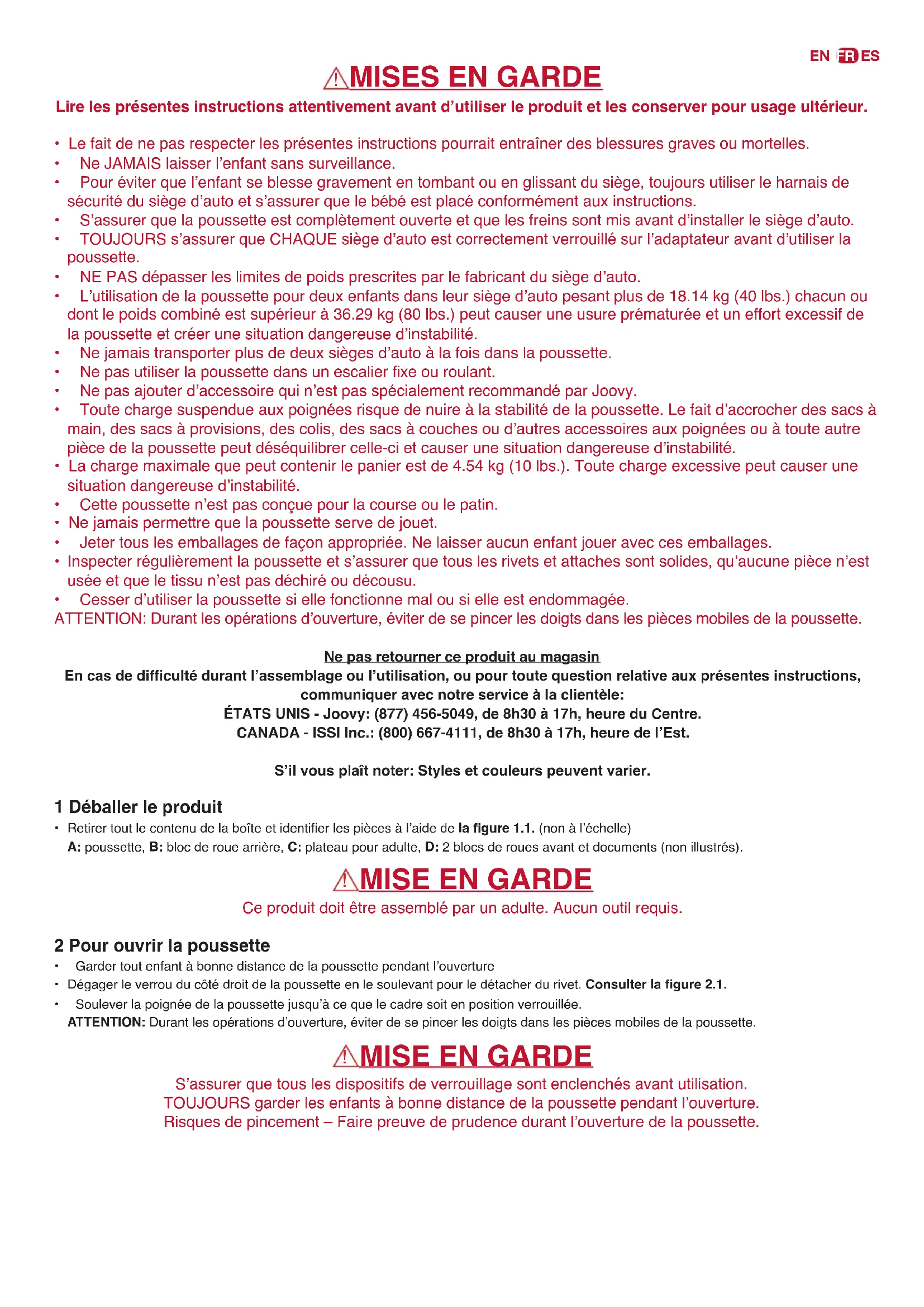 - Cesserd’utiliserlapoussettesiellefonctionnemalousielleestendommagée. ATTENTION:Durantlesopérationsd’ouverture,éviterdesepincerlesdoigtsdanslespiècesmobilesdelapoussette. Ne pas retourner ce produit au magasin En cas de difculté durant l’assemblage ou l’utilisation, ou pour toute question relative aux présentes instructions, communiquer avec notre service à la clientèle: ÉTATS UNIS - Joovy: (877) 456-5049, de 8h30 à 17h, heure du Centre. CANADA - ISSI Inc.: (800) 667-4111, de 8h30 à 17h, heure de l’Est. S’il vous plaît noter: Styles et couleurs peuvent varier. 1 Déballer le produit