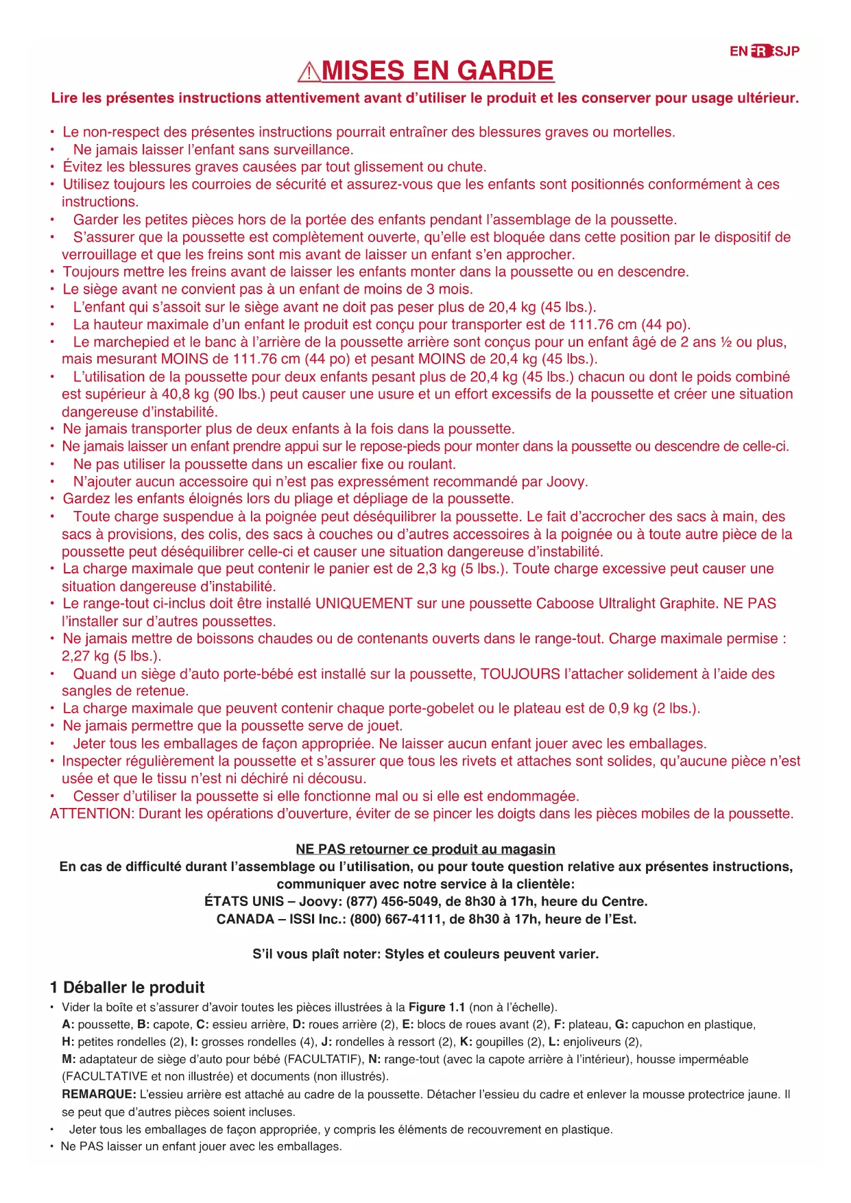 - Cesserd’utiliserlapoussettesiellefonctionnemalousielleestendommagée. ATTENTION:Durantlesopérationsd’ouverture,éviterdesepincerlesdoigtsdanslespiècesmobilesdelapoussette. NE PAS retourner ce produit au magasin En cas de difculté durant l’assemblage ou l’utilisation, ou pour toute question relative aux présentes instructions, communiquer avec notre service à la clientèle: ÉTATS UNIS – Joovy: (877) 456-5049, de 8h30 à 17h, heure du Centre. CANADA – ISSI Inc.: (800) 667-4111, de 8h30 à 17h, heure de l’Est. S’il vous plaît noter: Styles et couleurs peuvent varier. 1 Déballer le produit