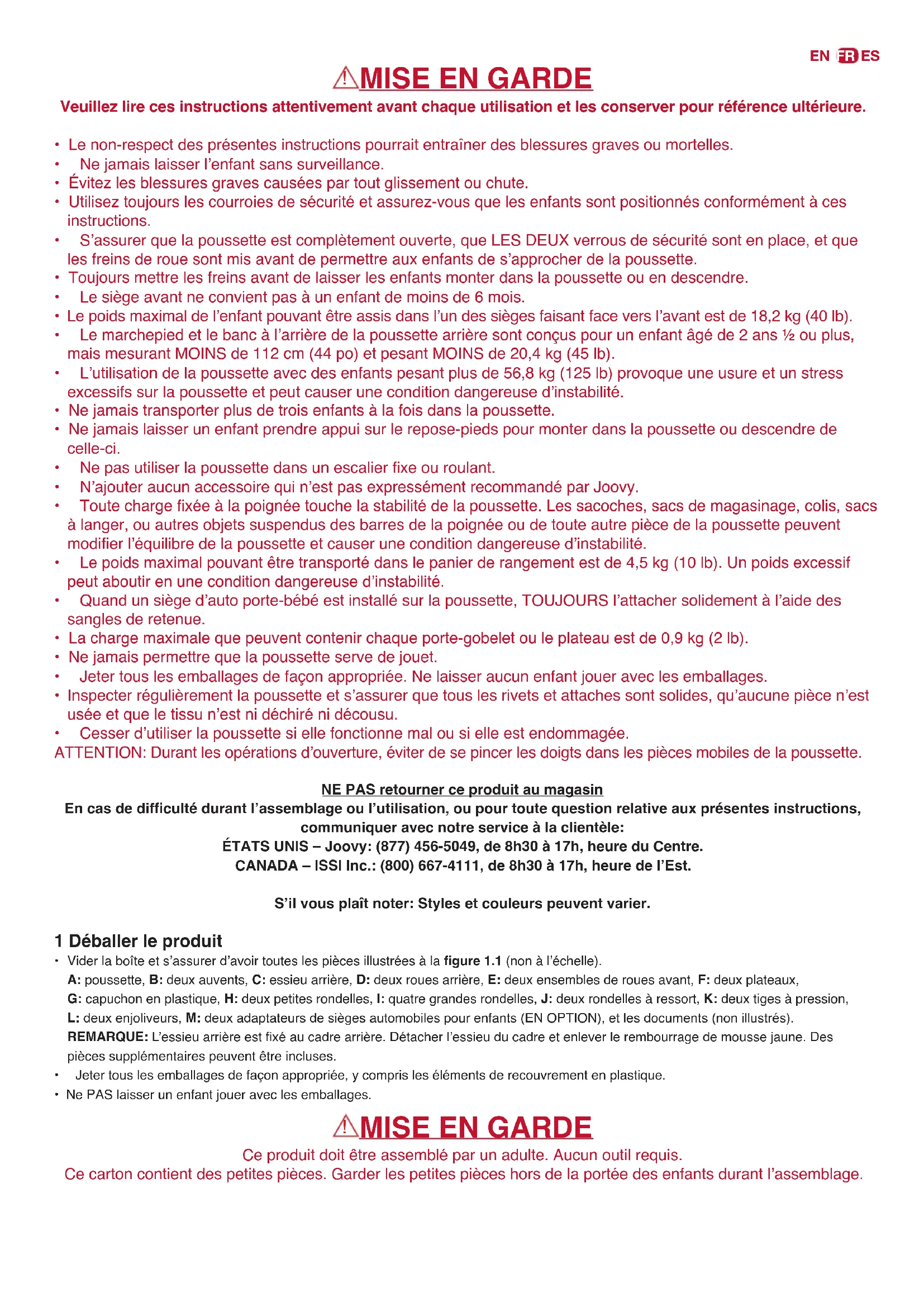 - Cesserd’utiliserlapoussettesiellefonctionnemalousielleestendommagée. ATTENTION:Durantlesopérationsd’ouverture,éviterdesepincerlesdoigtsdanslespiècesmobilesdelapoussette. NE PAS retourner ce produit au magasin En cas de difculté durant l’assemblage ou l’utilisation, ou pour toute question relative aux présentes instructions, communiquer avec notre service à la clientèle: ÉTATS UNIS – Joovy: (877) 456-5049, de 8h30 à 17h, heure du Centre. CANADA – ISSI Inc.: (800) 667-4111, de 8h30 à 17h, heure de l’Est. S’il vous plaît noter: Styles et couleurs peuvent varier. 1 Déballer le produit