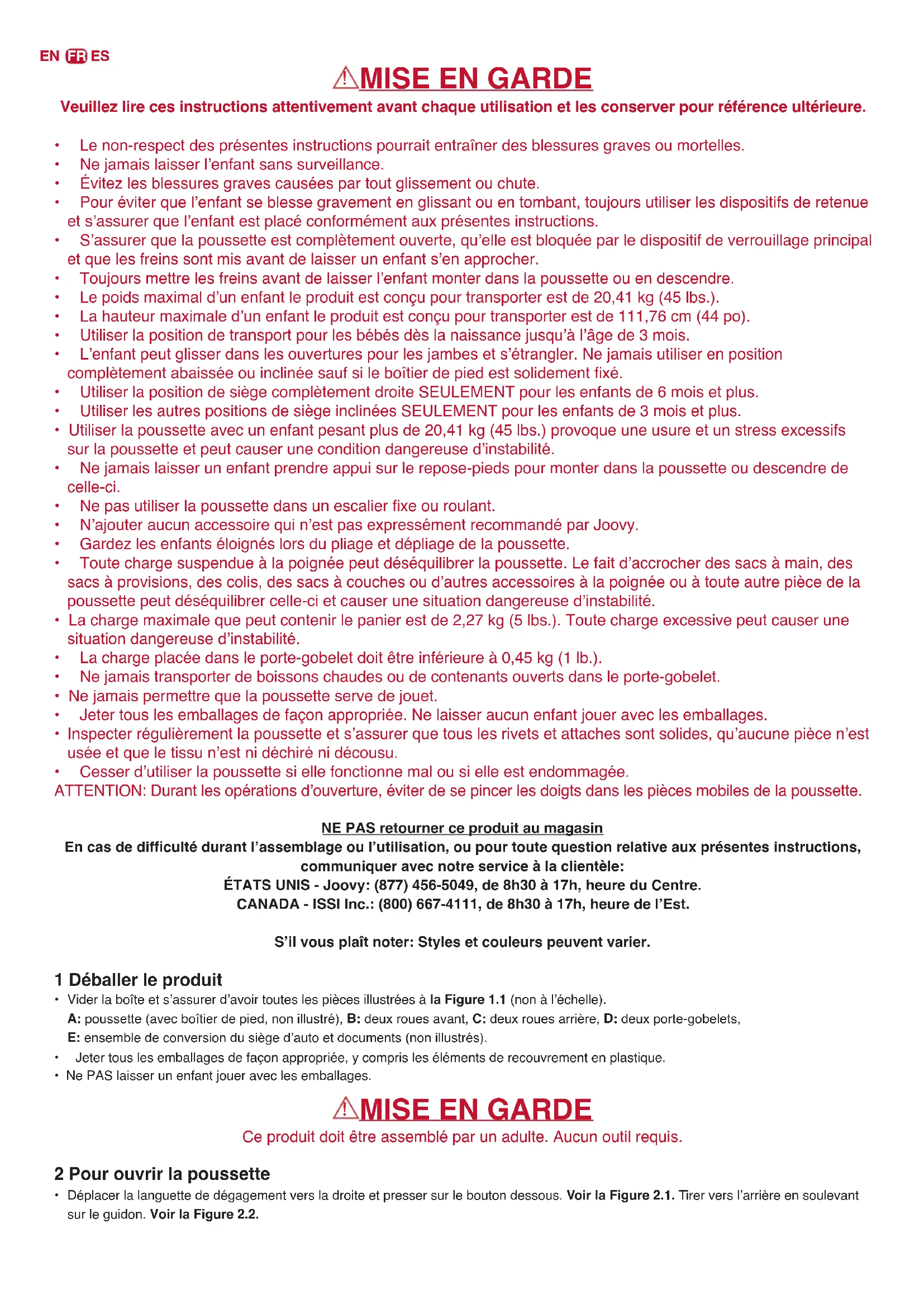 - Cesserd’utiliserlapoussettesiellefonctionnemalousielleestendommagée. ATTENTION:Durantlesopérationsd’ouverture,éviterdesepincerlesdoigtsdanslespiècesmobilesdelapoussette. NE PAS retourner ce produit au magasin En cas de difculté durant l’assemblage ou l’utilisation, ou pour toute question relative aux présentes instructions, communiquer avec notre service à la clientèle: ÉTATS UNIS - Joovy: (877) 456-5049, de 8h30 à 17h, heure du Centre. CANADA - ISSI Inc.: (800) 667-4111, de 8h30 à 17h, heure de l’Est. S’il vous plaît noter: Styles et couleurs peuvent varier. 1 Déballer le produit