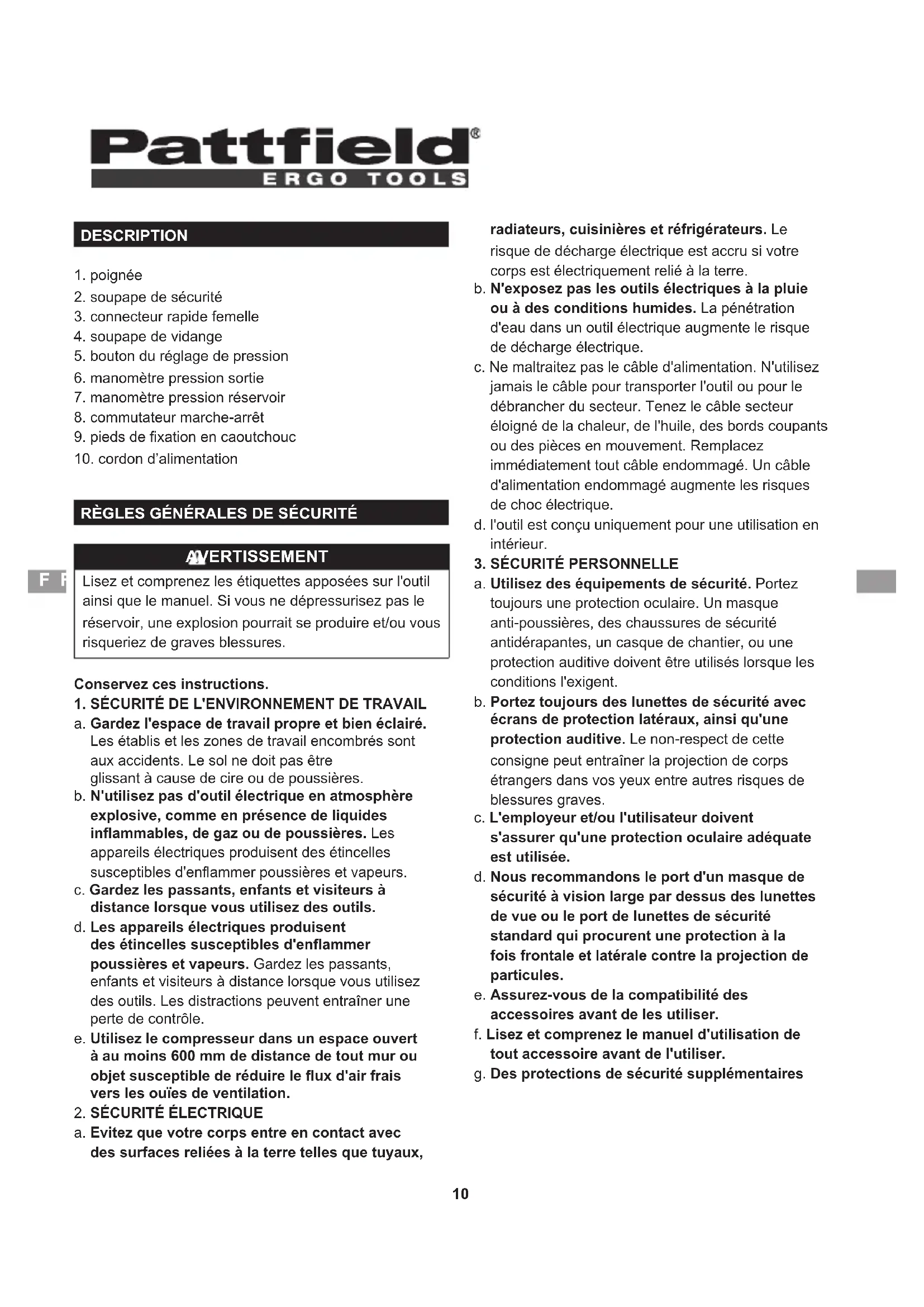 10. N'utilisez le compresseur que dans le cadre de son utilisation prévue. N'altérez pas et ne modifie pas l'appareil par rapport à sa conception ou à ses fonctionnalités d'origine.