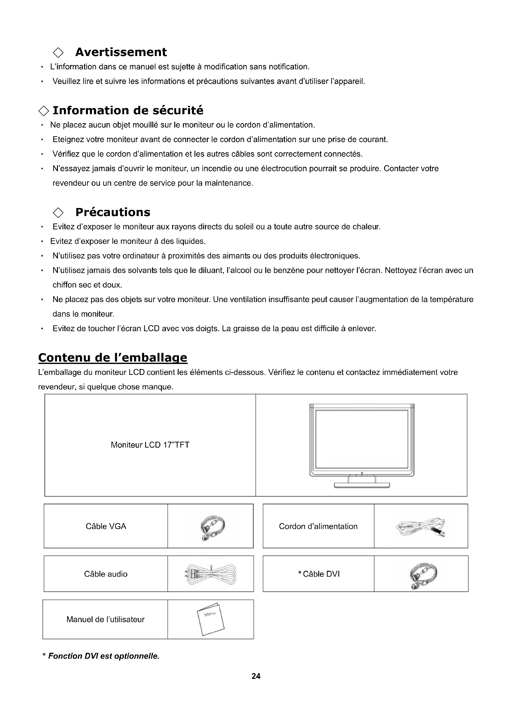 - Mode de menu OSD (On-Screen Display)………………………………………………………………26-27 Depannage………………………………………………………………………………………………… Minutages acceptes………………………………………………………………………………… ……28 Caractéristiques….……………………………………………………………………….………………2924 ◇ Avertissement ‧ L’information dans ce manuel est sujette à modification sans notification. ‧ Veuillez lire et suivre les informations et précautions suivantes avant d’utiliser l’appareil. ◇ Information de sécurité ‧ Ne placez aucun objet mouillé sur le moniteur ou le cordon d’alimentation. ‧ Eteignez votre moniteur avant de connecter le cordon d’alimentation sur une prise de courant. ‧ Vérifiez que le cordon d’alimentation et les autres câbles sont correctement connectés. ‧ N’essayez jamais d’ouvrir le moniteur, un incendie ou une électrocution pourrait se produire. Contacter votre revendeur ou un centre de service pour la maintenance. ◇ Précautions ‧ Evitez d’exposer le moniteur aux rayons directs du soleil ou a toute autre source de chaleur. ‧ Evitez d’exposer le moniteur à des liquides. ‧ N’utilisez pas votre ordinateur à proximités des aimants ou des produits électroniques. ‧ N’utilisez jamais des solvants tels que le diluant, l’alcool ou le benzène pour nettoyer l’écran. Nettoyez l’écran avec un chiffon sec et doux. ‧ Ne placez pas des objets sur votre moniteur. Une ventilation insuffisante peut causer l’augmentation de la température dans le moniteur. ‧ Evitez de toucher l’écran LCD avec vos doigts. La graisse de la peau est difficile à enlever. Contenu de l’emballage L’emballage du moniteur LCD contient les éléments ci-dessous. Vérifiez le contenu et contactez immédiatement votre revendeur, si quelque chose manque. Moniteur LCD 17”TFT p. 28