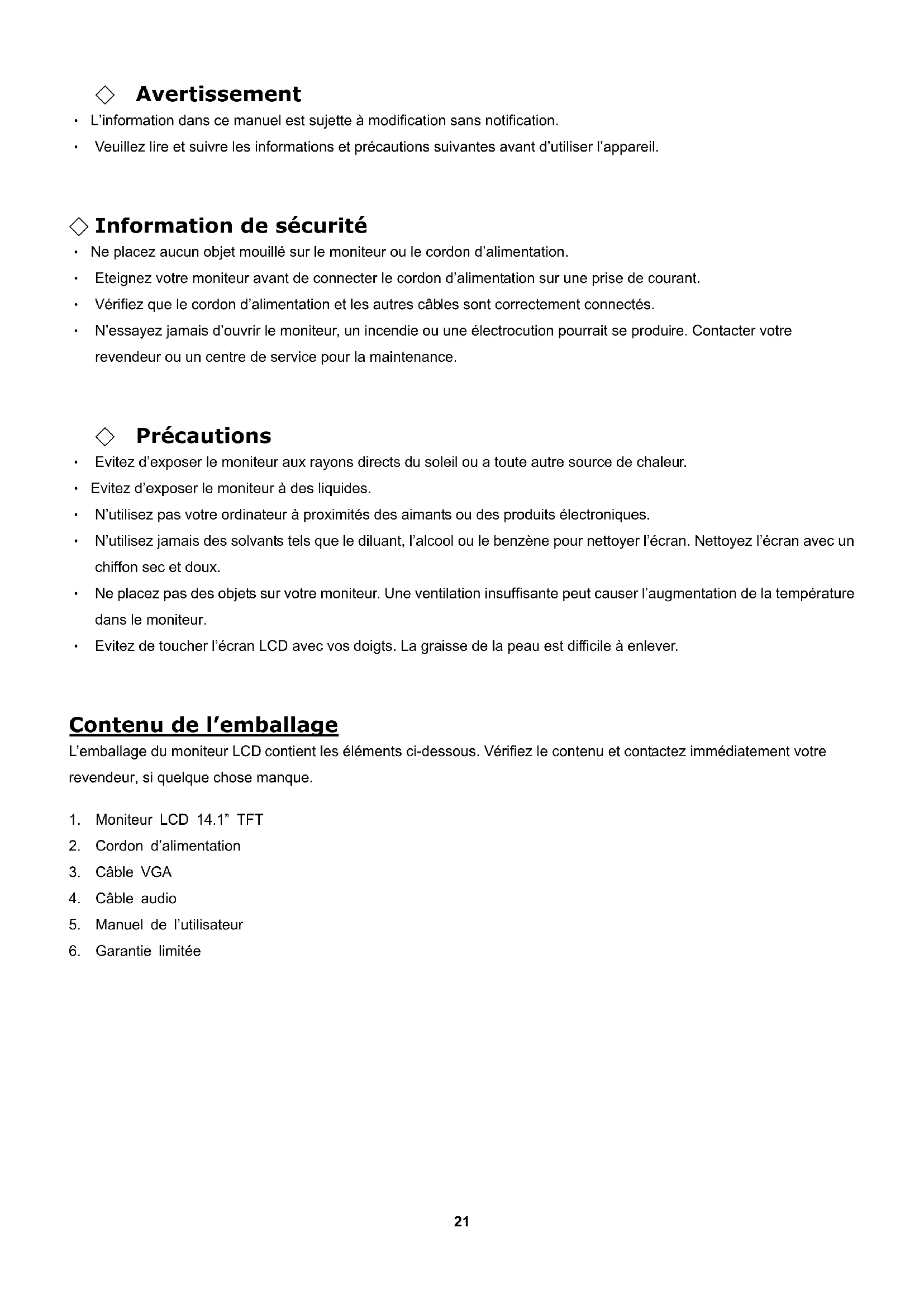 ◇ Précautions ‧ Evitez d’exposer le moniteur aux rayons directs du soleil ou a toute autre source de chaleur. ‧ Evitez d’exposer le moniteur à des liquides. ‧ N’utilisez pas votre ordinateur à proximités des aimants ou des produits électroniques. ‧ N’utilisez jamais des solvants tels que le diluant, l’alcool ou le benzène pour nettoyer l’écran. Nettoyez l’écran avec un chiffon sec et doux. ‧ Ne placez pas des objets sur votre moniteur. Une ventilation insuffisante peut causer l’augmentation de la température dans le moniteur. ‧ Evitez de toucher l’écran LCD avec vos doigts. La graisse de la peau est difficile à enlever.