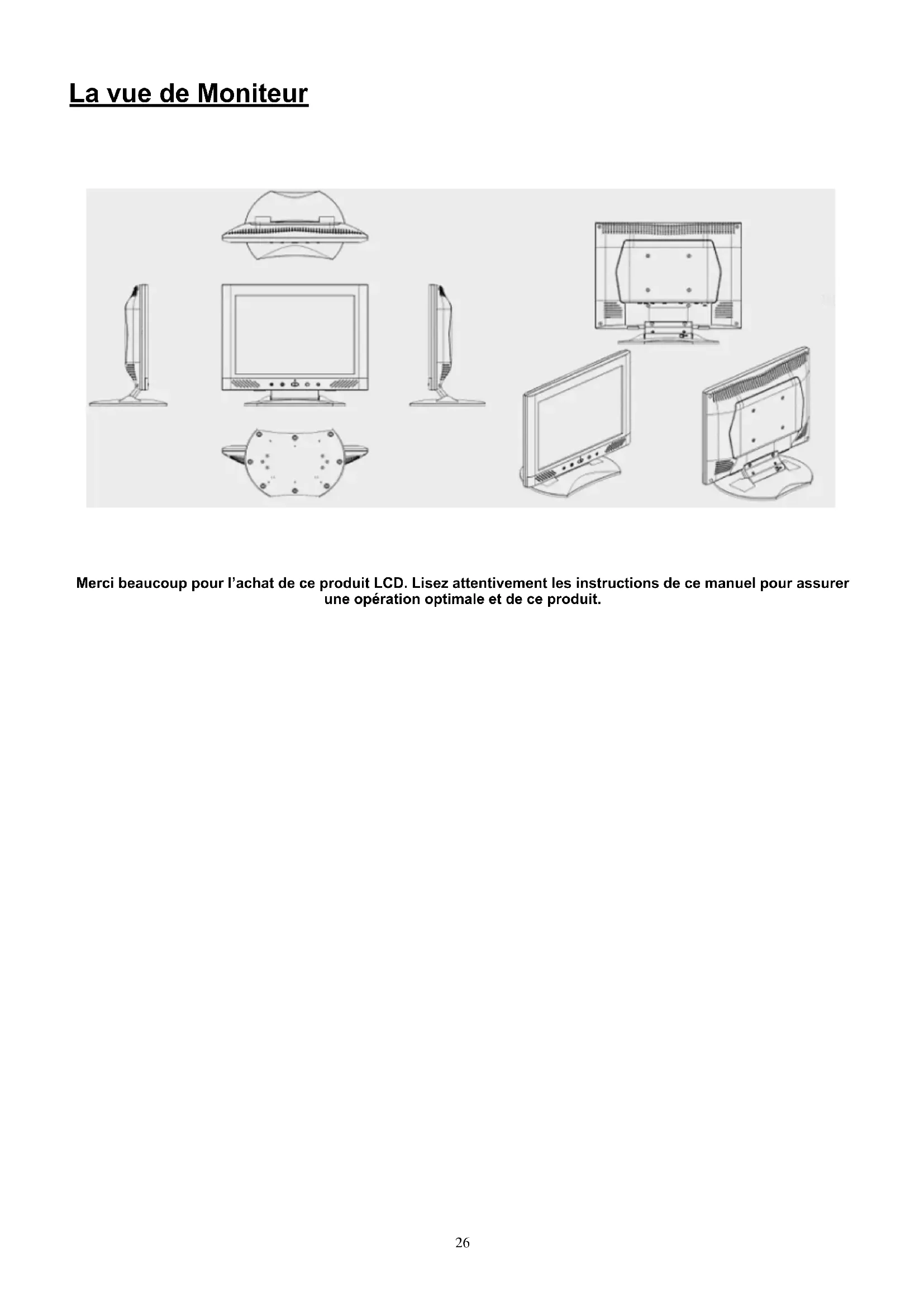 Merci beaucoup pour l’achat de ce produit LCD. Lisez attentivement les instructions de ce manuel pour assurer une opération optimale et de ce produit.27 Déballage Notre 15” le moniteur de LCD sera content avec ces articles suivants. S'assure que vous recevez tout ceux-ci règlent prêt, autrement le contact au négociant ou le magasin que vous avez acheté. Enfin, sans sens pour nous contacter. 15” Le Moniteur de LCD DE TFT